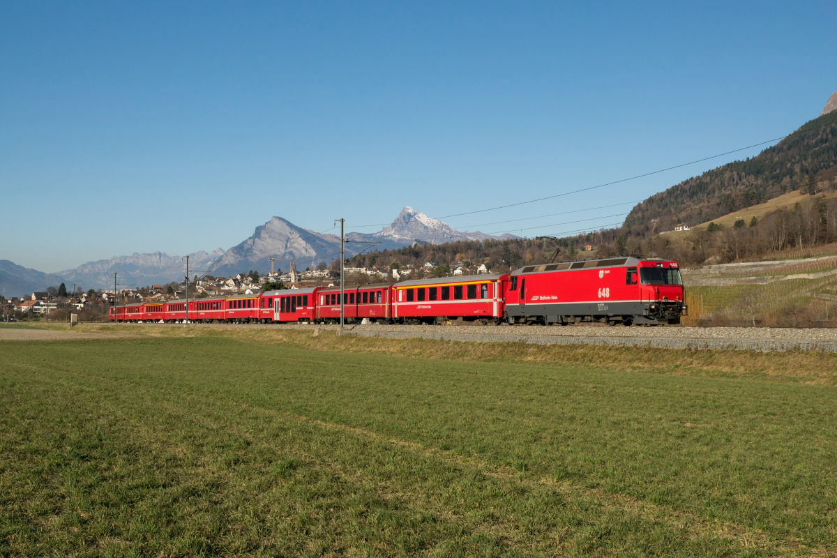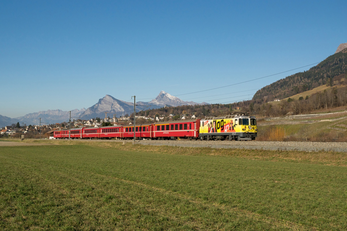 Adventsfahrt des Vereins pro Salonwagen: Der von der Ge 4/4 II 617 und der Ge 4/4 II 614 gezogene Salonwagen-Zug verlässt am 04.12.2016 Malans in Richtung Klosters und weiter durch den Vereina-Tunnel nach St. Moritz. Sandro Gadola