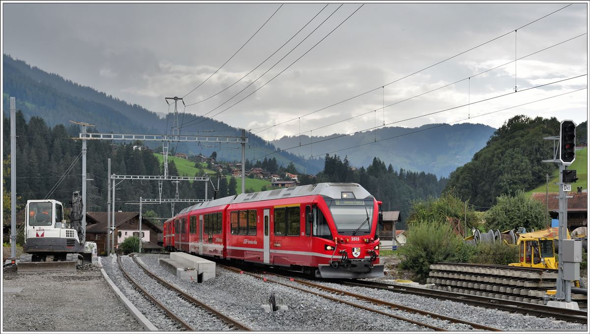 RE1057 mit ABe 8/12 3515 nach Davos Platz fährt in Küblis ein. Dem linken Gleis (Hausperron) fehlt noch die talseitige Weiche als Anschluss zur kurzen Doppelspur Richtung Fideris. (30.08.2016) Herbert Graf