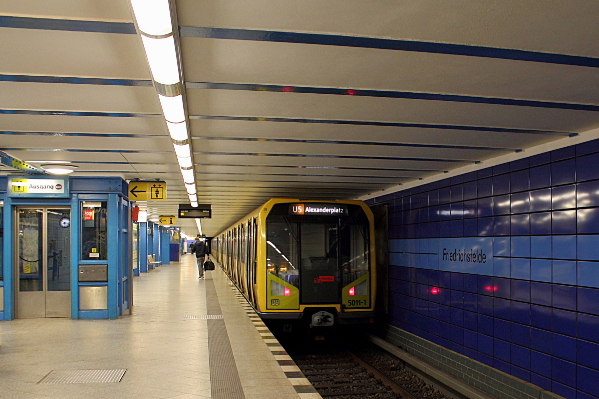 Der U-Bahnzug 5011 der Bauart H 97 auf der Linie U 5 von Hönow nach Alexanderplatz beim Halt am 20.03.2016 in der Station Friedrichsfelde. Der Zug wurde 1998 bei Adtranz gebaut und hatte am 07.11.2012 seine letzte HU. Heinz Lahs