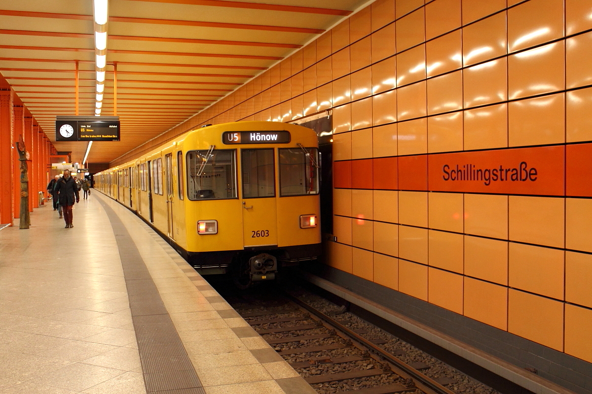 Die U-Bahnwagen 2602/2603 der Bauart F 76 E auf der Linie U 5 von Alexanderplatz nach Hönow beim Halt am 17.02.2016 in der Station Schillingstraße.