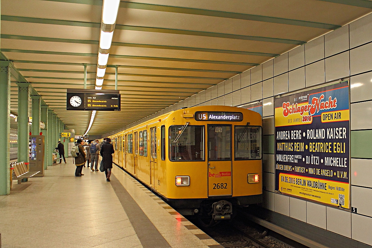 Die U-Bahnwagen 2682/2683 der Bauart F 79 auf der Linie U 5 von Hönow nach Alexanderplatz beim Halt am 17.02.2016 in der Station Strausberger Platz.