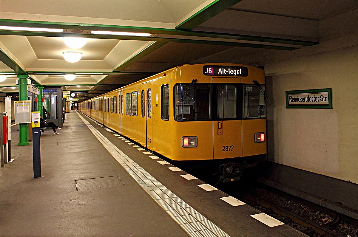 Die U-Bahnwagen 2872/2873 der Bauart F 90 auf der Linie U 6 von Alt-Mariendorf nach Alt-Tegel beim Halt am 28.02.2016 in der Station Reinickendorfer Straße.