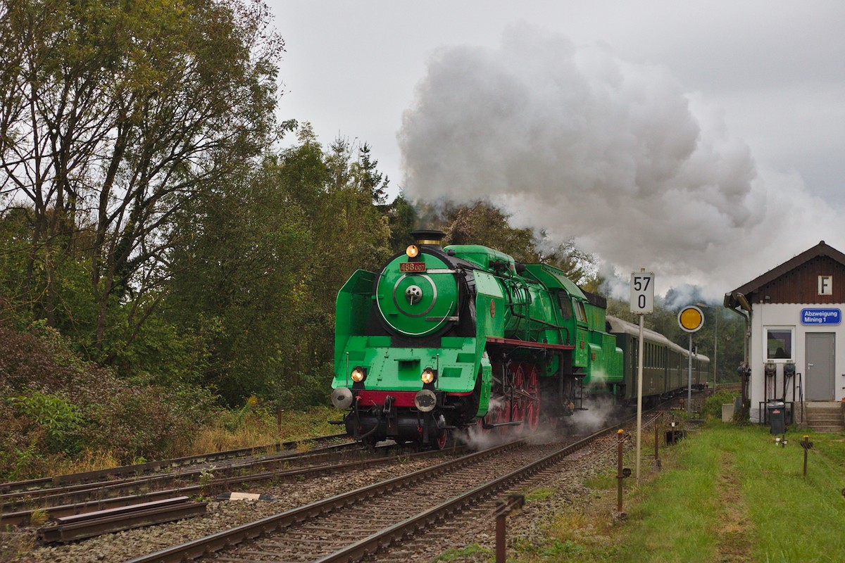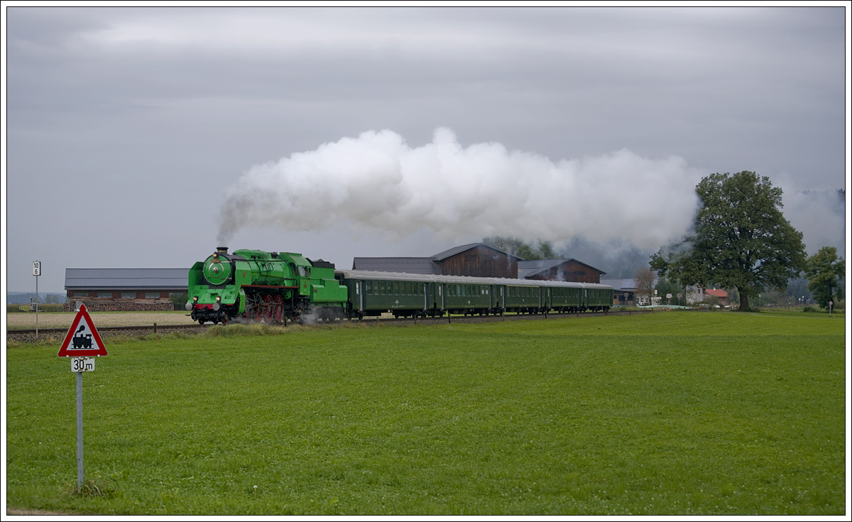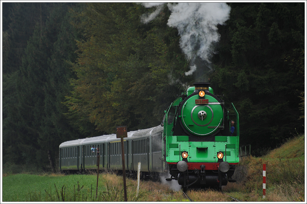 Kurz nach dem Bahnhof Mattighofen ist diese Aufnahme entstanden. Sie zeigt den ÖGEG Fotozug mit der tschechoslowakischen 486.007. (02.10.2016) Markus Pöschl