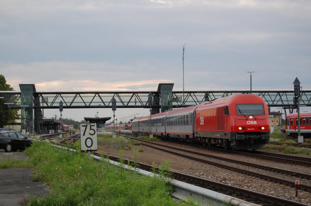 2016 071 am 23.08.2010 wegen Bauarbeiten, mit dem München - Linz - Express nur ab Mühldorf, hier im Bahnhof Mühldorf (Inn).