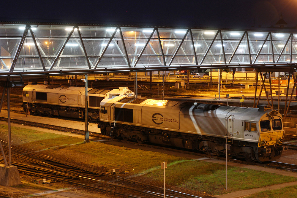 247 026 steht unterhalb des Fußgängerstegs im Mühldorfer Bahnhof. Das Foto entstand am 13. Oktober 2016.