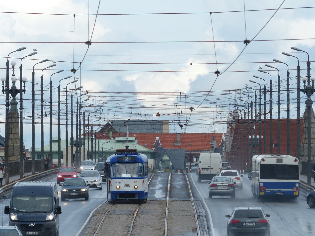 Die Akmens tilts ist eine Brücke in Riga, die die Daugava überquert. Die Tatra T3A mit der Nummer 30721 nutzt unbeeindruckt vom tosenden Verkehr ihre eigene Trasse. 7.8.2016, Riga Thomas Wendt
