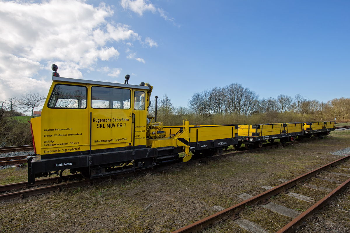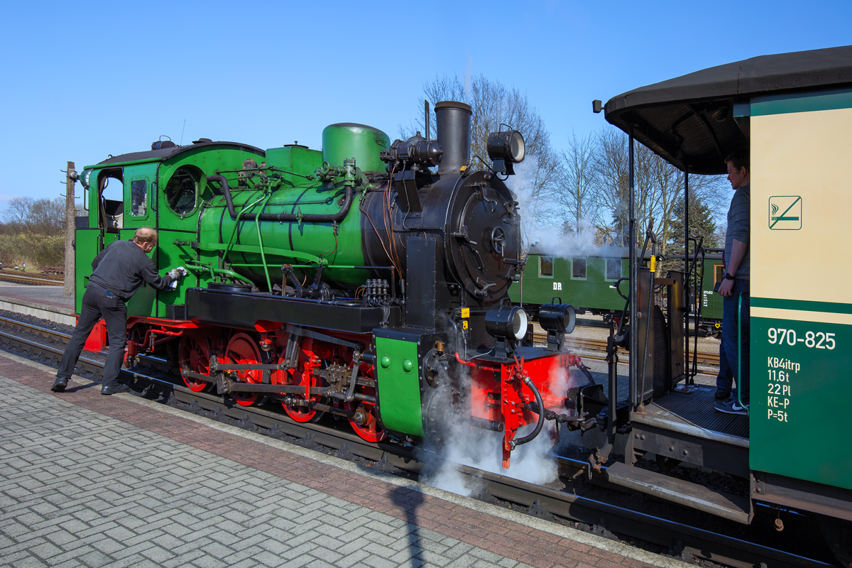 Um 15.56 Uhr fuhr Mh 52 der RBB in Putbus an die am Bahnsteig bereitstehenden Reisezugwagen. Nachdem der Zeiger auf 16.08 Uhr umsprang, setzte sich der Zug nach Göhren in Bewegung. - 09.04.2016