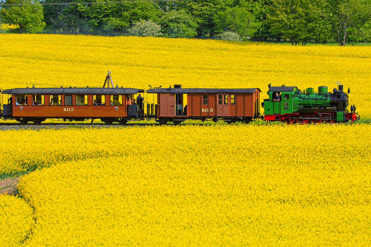 Historischer Zug mit den Lok’s 112 703 und 91 134 beim Bahnhofsfest in Putbus zwischen Bergen auf Rügen und Lauterbach Mole im Einsatz. Hier ist der Zug von Putbus nach Lauterbach Mole gerade abgefahren- 21.05.2016