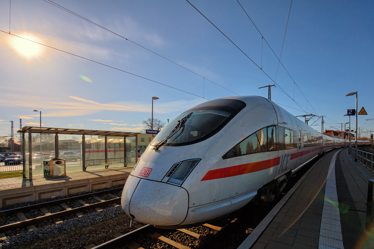 Ausfahrt des ICE 1632 im Gegenlicht auf dem Bahnhof Pasewalk in Richtung Berlin.