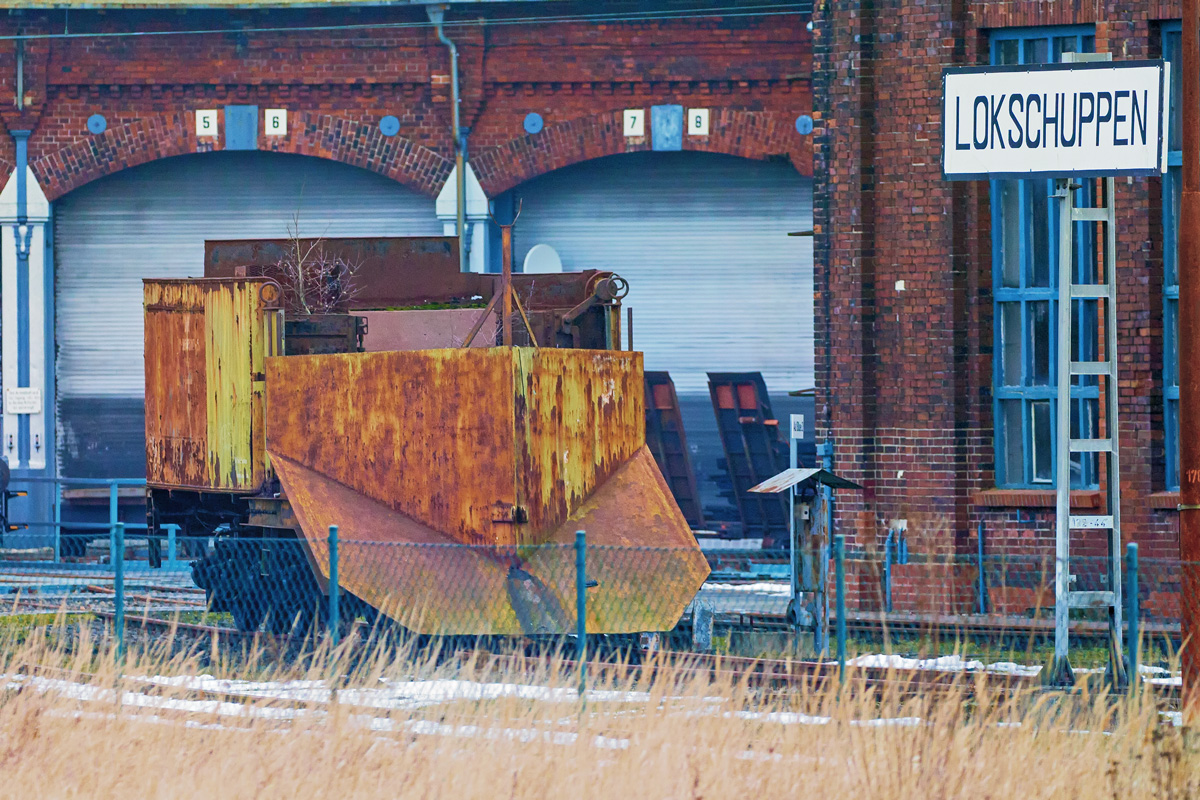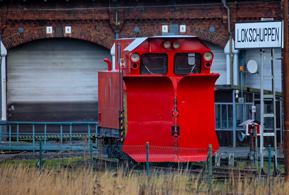 Schneepflug Meiningen SPM 412 wurde auf dem Gelände des Pomerania e.V. abgestellt. Der Zaun trennt das Gelände zwischen Verein und Bf Pasewalk. - 15.12.2016 - Aufgenommen vom Bahnsteig 4 in Pasewalk.