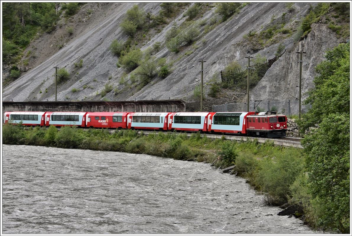 Ge 4/4 I 605 "Silvretta" kam gestern mit dem Glacier Express 901 wieder einmal zu Schnellzugsehren, hier über dem Hochwasser führenden Hinterrhein in Reichenau-Tamins. (17.06.2016) Herbert Graf