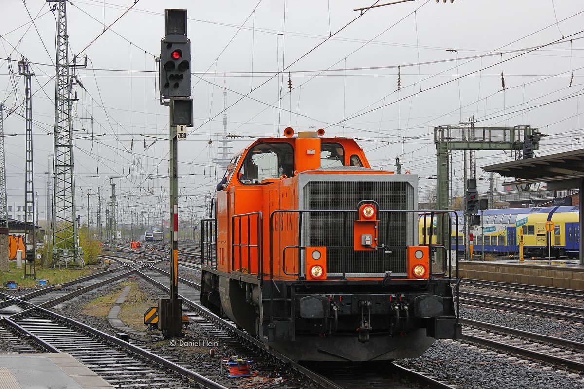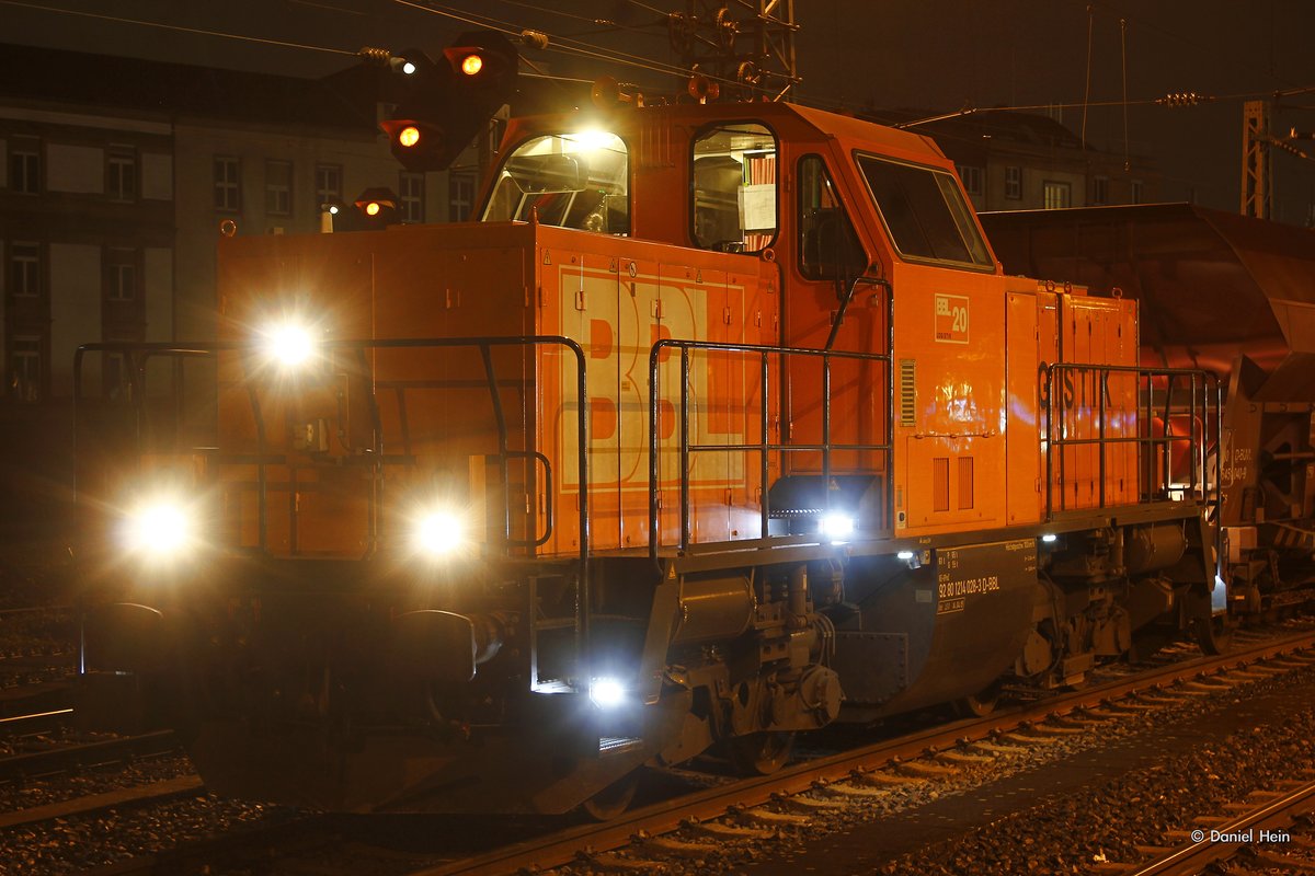 BBL Logistik 214 028-3 (V100 West modernisiert) mit drei Schotterwagen in Maintal Ost