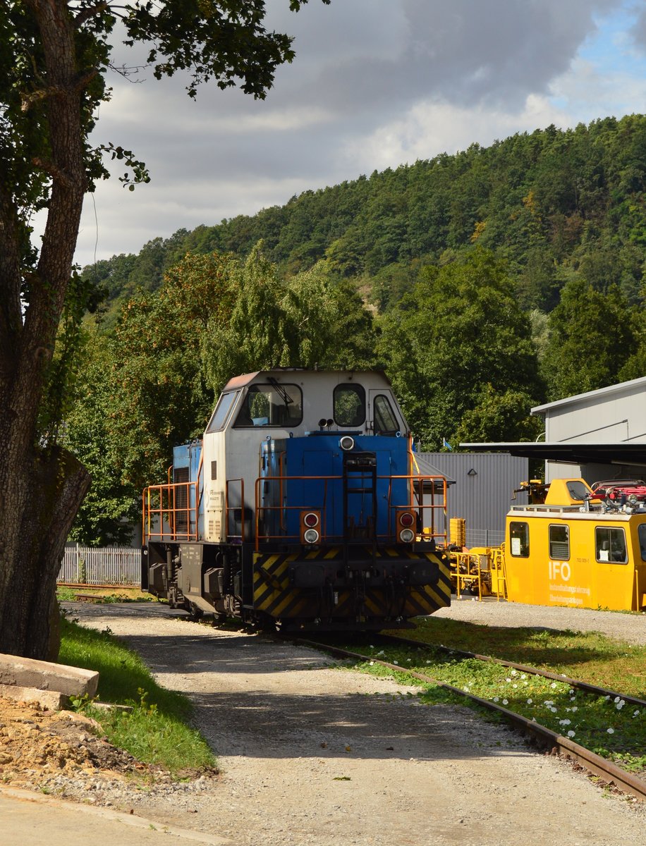 Da steht eine hauseigene Werksbahnlok (0580 011-1) von Peine und Salzgitter auf dem Zufahrtsgleis in Mosbach bei Gmeinder, die Frage ist ob sie gerade gebracht worden ist oder aber sie steht vor der Rückführung ins Werk. Mosbach den 21.8.2016 Andreas Strobel