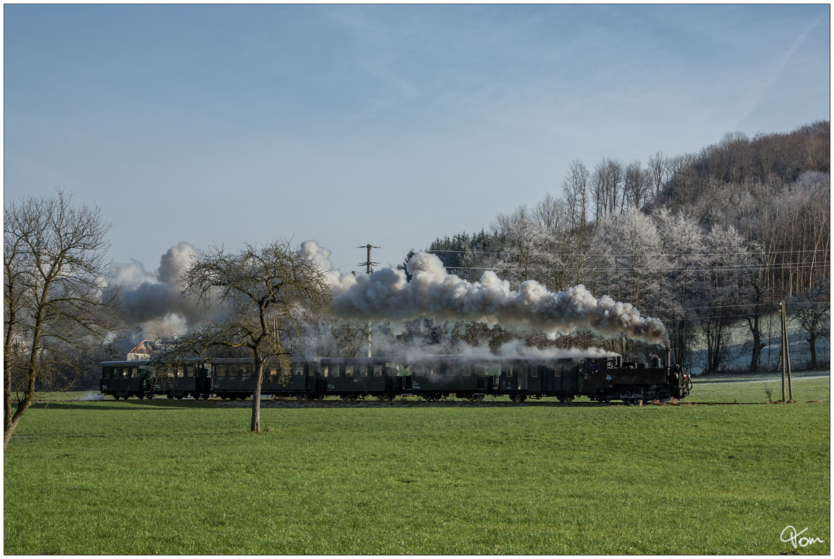 Eisenbahnromantik pur gibt es immer auf der Steyrtalbahn, hier zuckelt die 298.102 gemächlich mit einem Adventzug durch das Steyrtal.