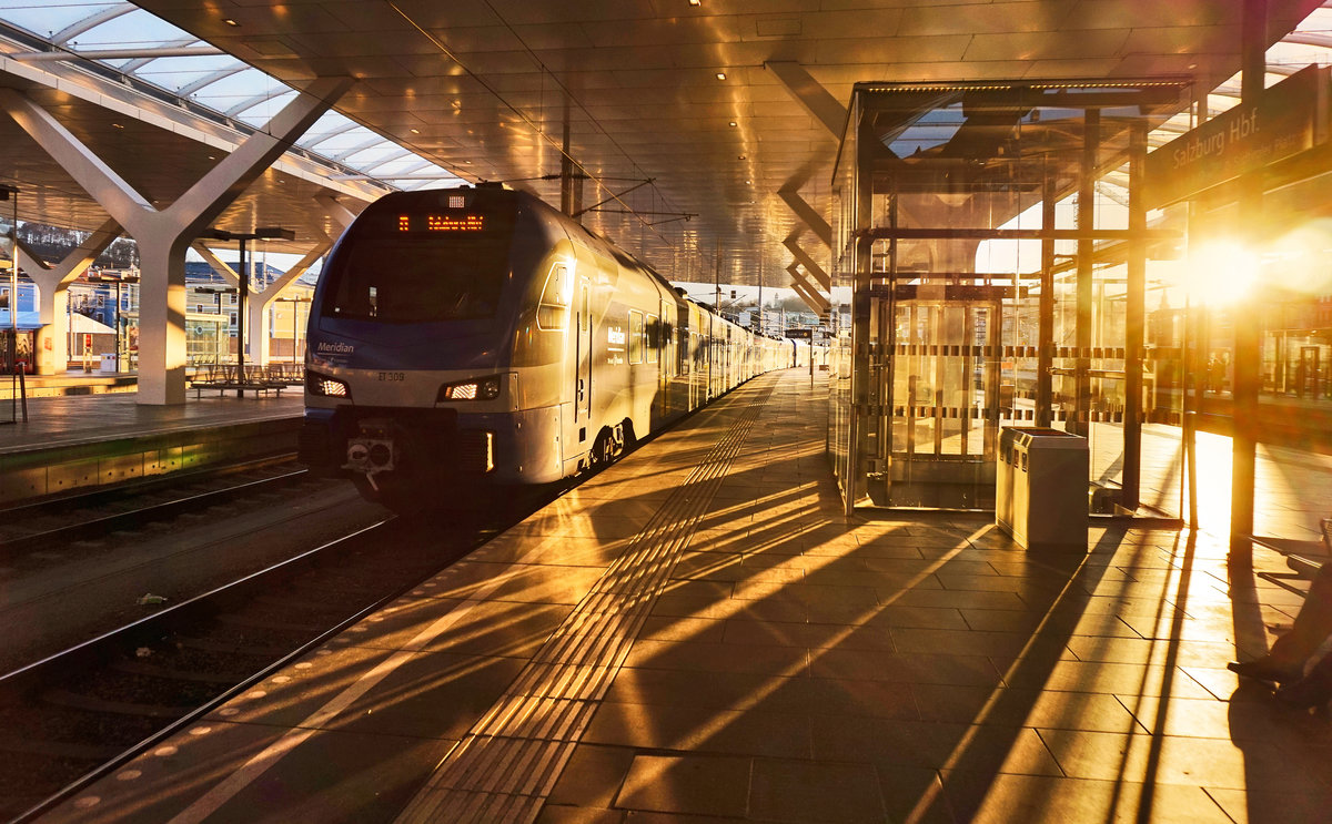 Eine Meridian Doppeleinheit bestehend aus ET 309 und ET 312, fährt als M 79023 aus München Hbf, in den Bahnhof ein.