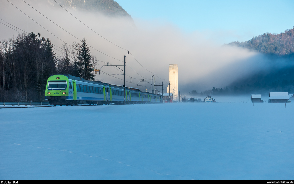 Vom Mittelland her drückt der Nebel ins Simmental. Die untergehende Sonne reicht schon nicht mehr bis an den Talboden, beleuchtet aber noch die Silotürme der Mühle Burgholz, als am 24. Dezember 2017 der RE Interlaken - Zweisimmen in Form eines EW-III-Pendels der BLS vorüber fährt. Julian Ryf