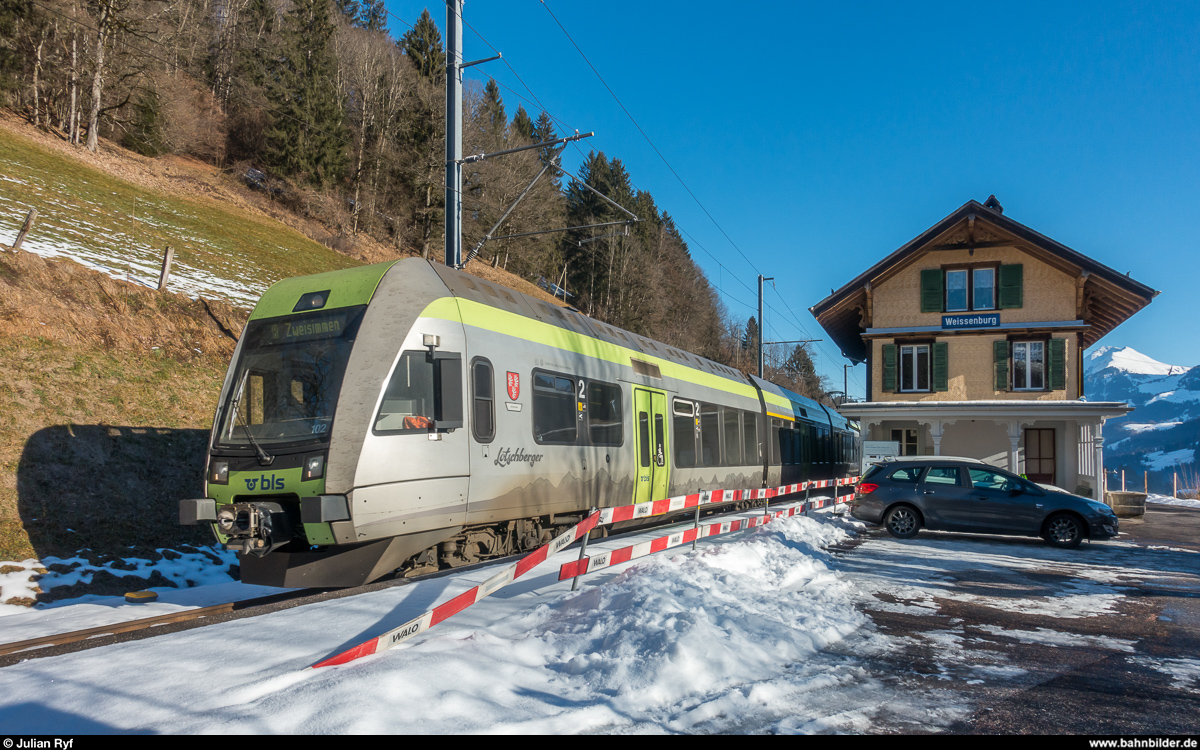 Weissenburg hat im letzten Jahr ein neues Perron auf der anderen Seite des Bahnhofsgebäudes in erhalten und das Bahnhofsgebäude wurde renoviert. Am 24. Dezember 2017 fährt Lötschberger RABe 535 102 "Schüpfheim" am alten Perron vorüber.