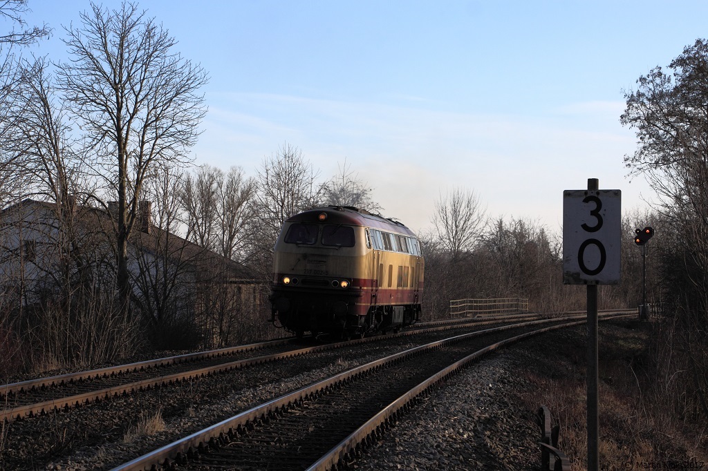 Momentan ist die immer noch quicklebendige 217 002 von Bahn-Touristik-Express an die evb- Außenstelle in Regensburg vermietet und entsprechend oft auf sämtlichen Strecken rund um Regensburg anzutreffen. Wie hier am Abzweig Hafenbrücke, als die - trotz Dreckschicht - stets hübsch anzuschauende Maschine im Block hinter Alex 84110 Richtung Norden fährt. 25.02.17 Martin K.
