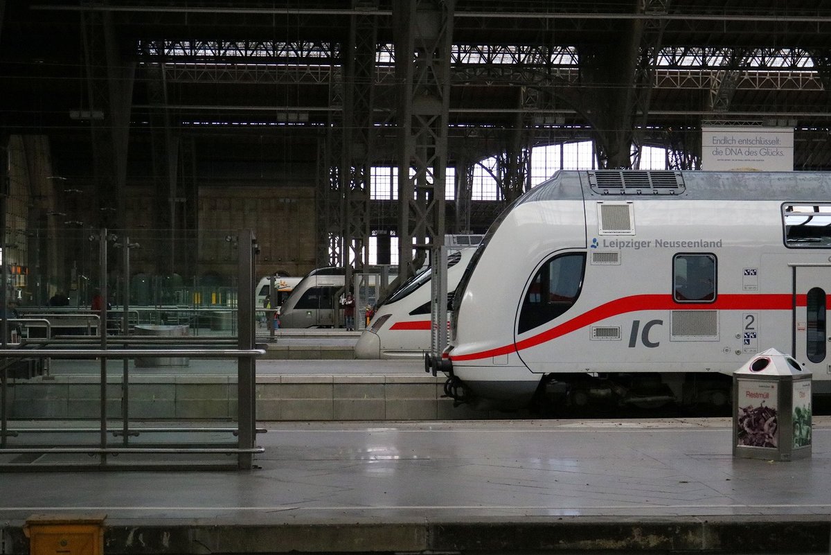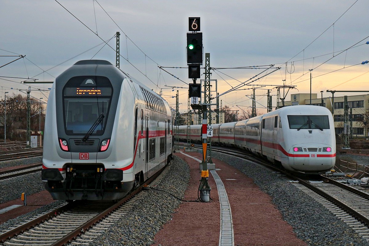 Während der ICE 1 einige Zeit zum Beschleunigen benötigt, schafft es der IC2 deutlich schneller auf seine 60 km/h. So entstand diese beeindruckende Parallelausfahrt in Halle(Saale)Hbf.