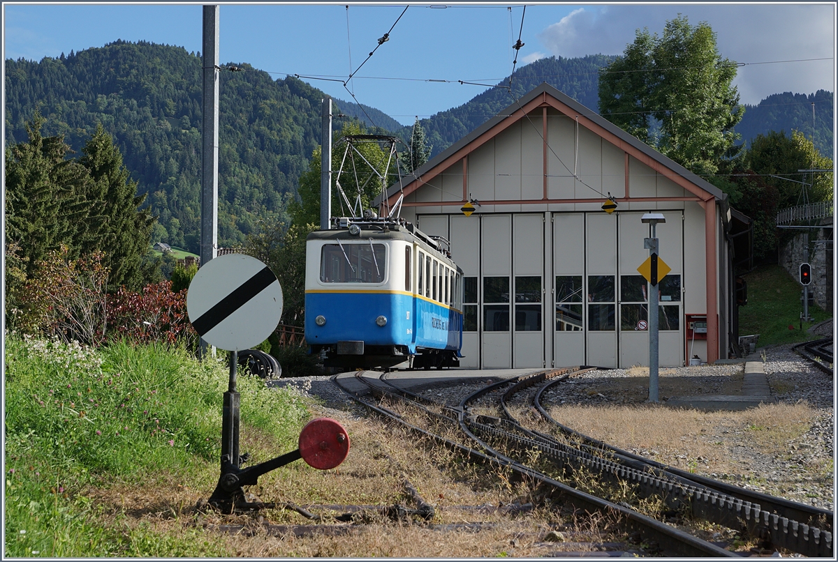 125 Jahre Rochers de Naye Bahn: Ein Bild, welches nur dank den Feierlichkeiten 125 Jahre Glion Rochers de Naye BB.de komform ist: Der Rochers de Naye Bhe 2/4 207 steht vor dem Depot in Glion und wartet auf seinen Einsatz in der Fahrzeug Parade um 10:30.