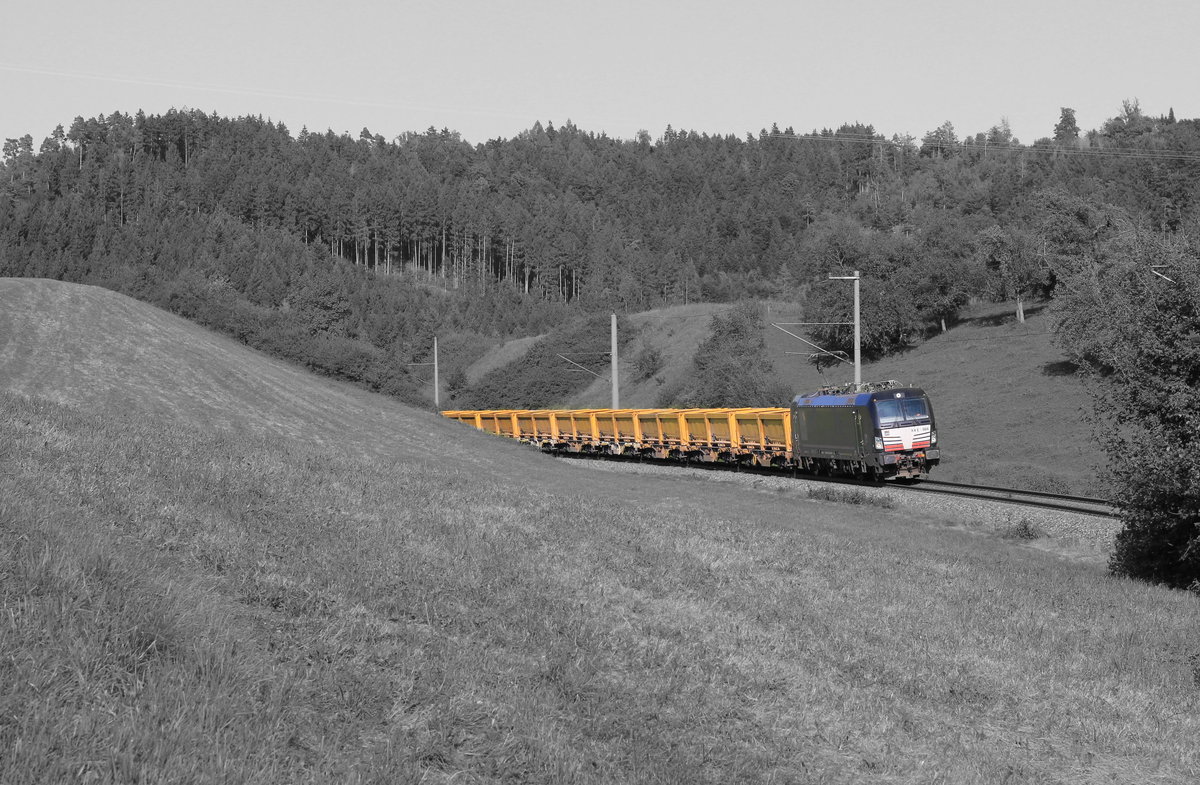 Am 29.08.2017 zieht 193 866 einen leeren Aushubzug in Richtung Baustelle am Stuttgarter Nordbahnhof. Die Aufnahme entstand zwischen Gaildorf und Fichtenberg. Fluffy