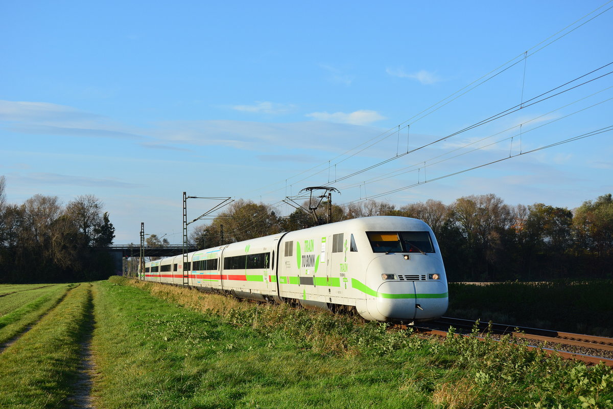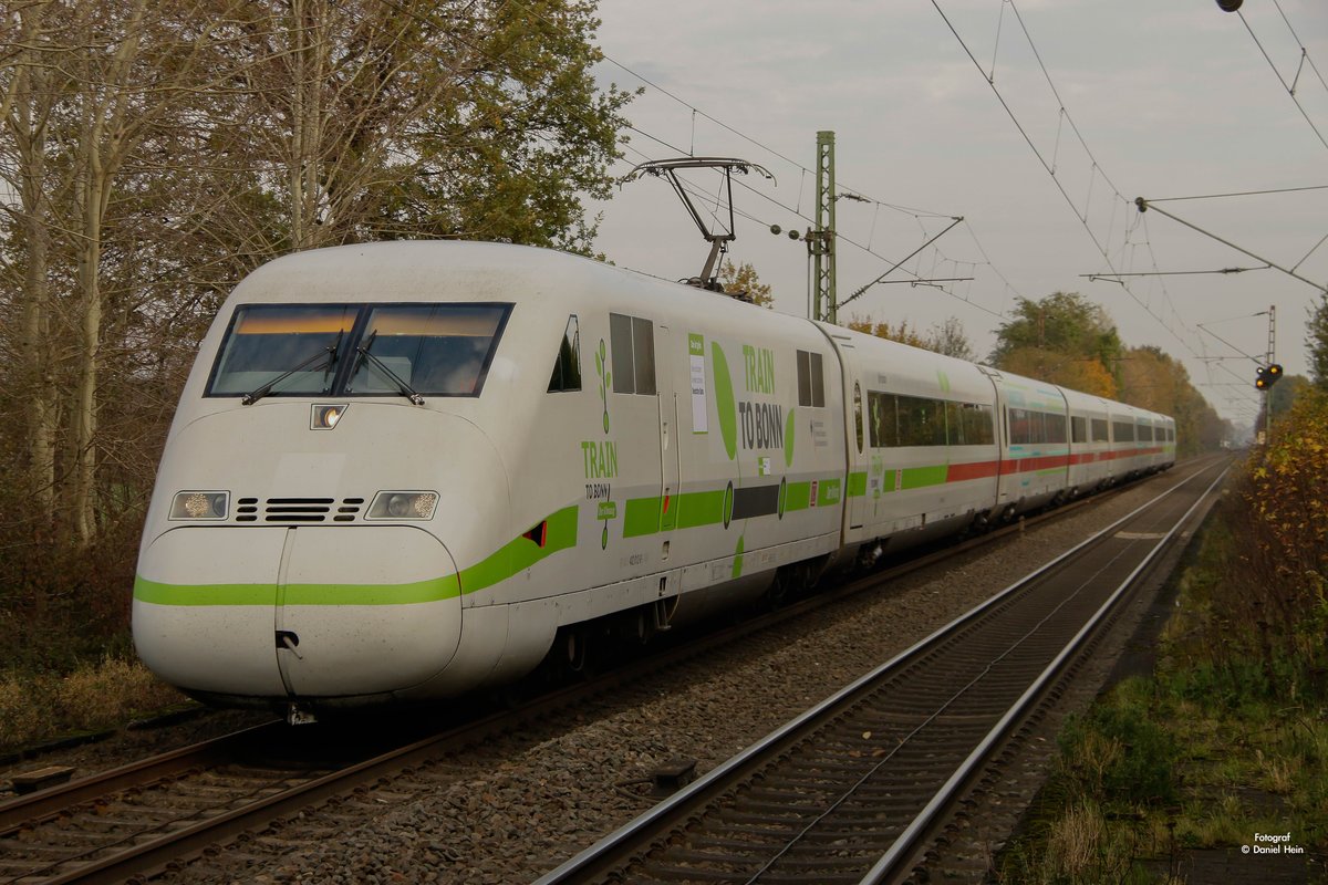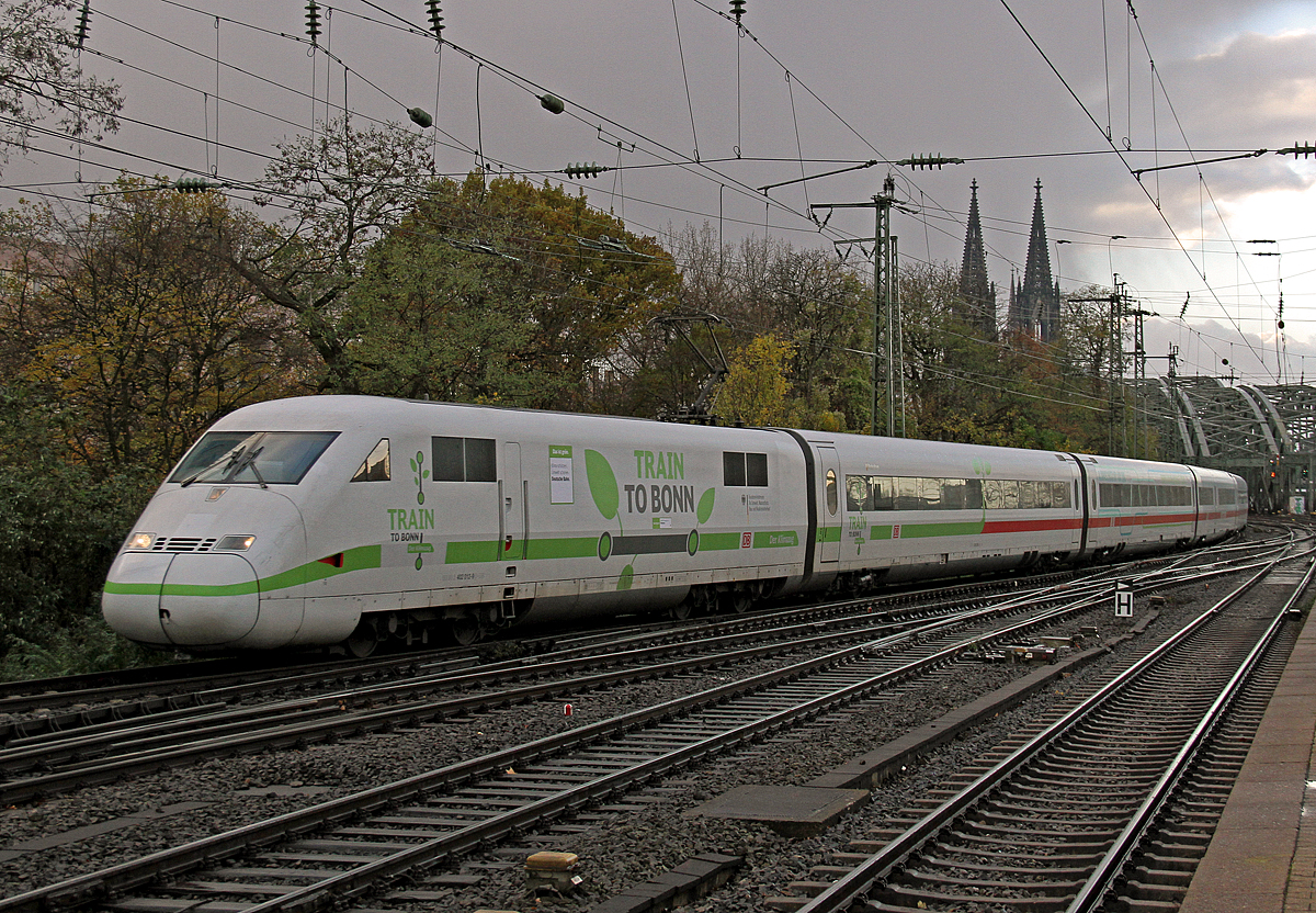 Am 4.11.17 fuhr der 402 012 als TRAIN TO BONN Regierungszug zum Klimagipfel nach Bonn. Begleitet wurde er dabei von Polizeihubschraubern, die ihn schon ankündigten. 402 012 wurde extra komplett gereinigt und beklebt. Er war wohl der sauberste 402er seit langen. Hier durchfährt der TRAIN TO BONN Bornheim.