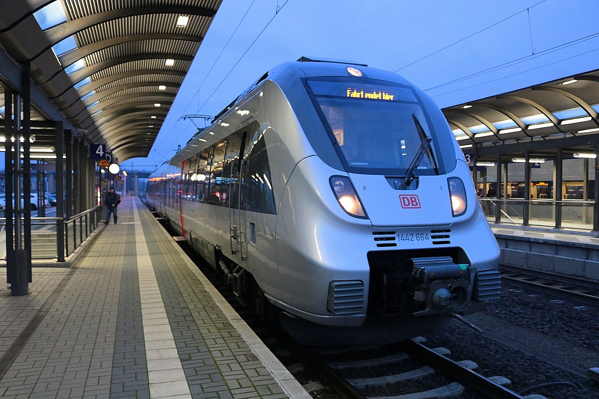 1442 664 (Bombardier Talent 2) der S-Bahn Mitteldeutschland (MDSB II | DB Regio Südost) als S 37216 (S2) von Leipzig-Stötteritz steht in ihrem Endbahnhof Lutherstadt Wittenberg Hbf auf Gleis 4. [16.12.2017 | 8:00 Uhr] Clemens Kral