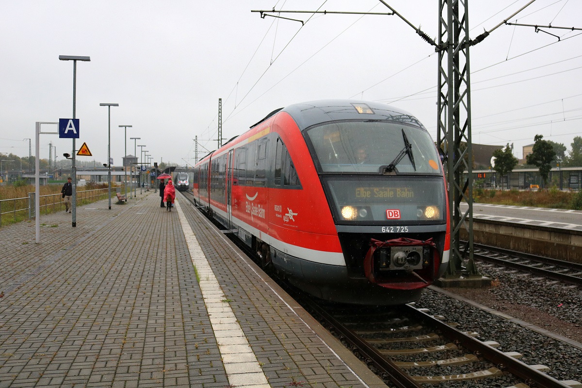 642 725 "Schloss Hundisburg" (Siemens Desiro Classic) der Elbe-Saale-Bahn (DB Regio Südost) als Pendelverkehr zum ehemaligen Bw Lutherstadt Wittenberg anlässlich der jährlichen Bahnaktionstage steht in seinem Startbahnhof Lutherstadt Wittenberg Hbf bereit. [24.9.2017 | 10:42 Uhr] Clemens Kral