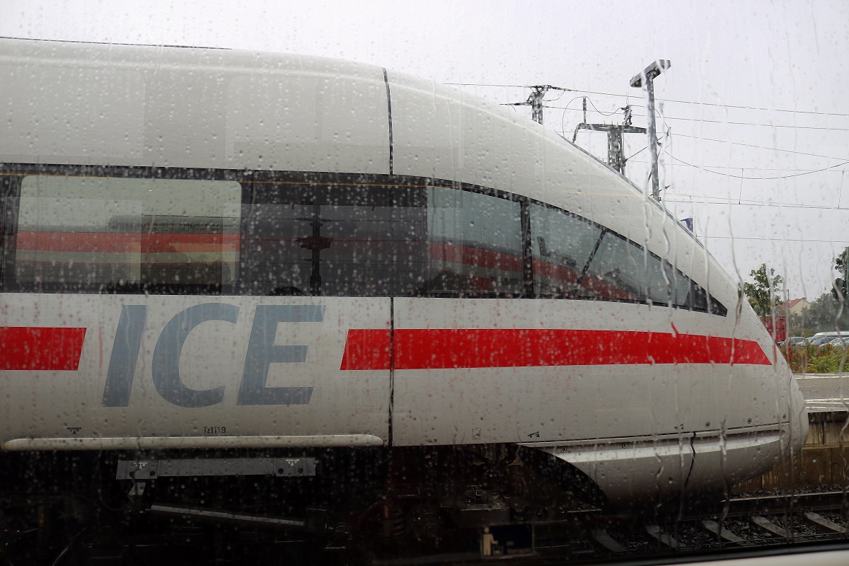 Der Blick aus dem verregneten Fenster von 642 725 "Schloss Hundisburg" der Elbe-Saale-Bahn (DB Regio Südost) zeigt 411 519 (Tz 1119 "Meißen") als ICE 1514 (Linie 28) von Leipzig Hbf nach Hamburg-Altona, der in Lutherstadt Wittenberg Hbf auf Gleis 3 hält. [24.9.2017 | 10:55 Uhr] Clemens Kral