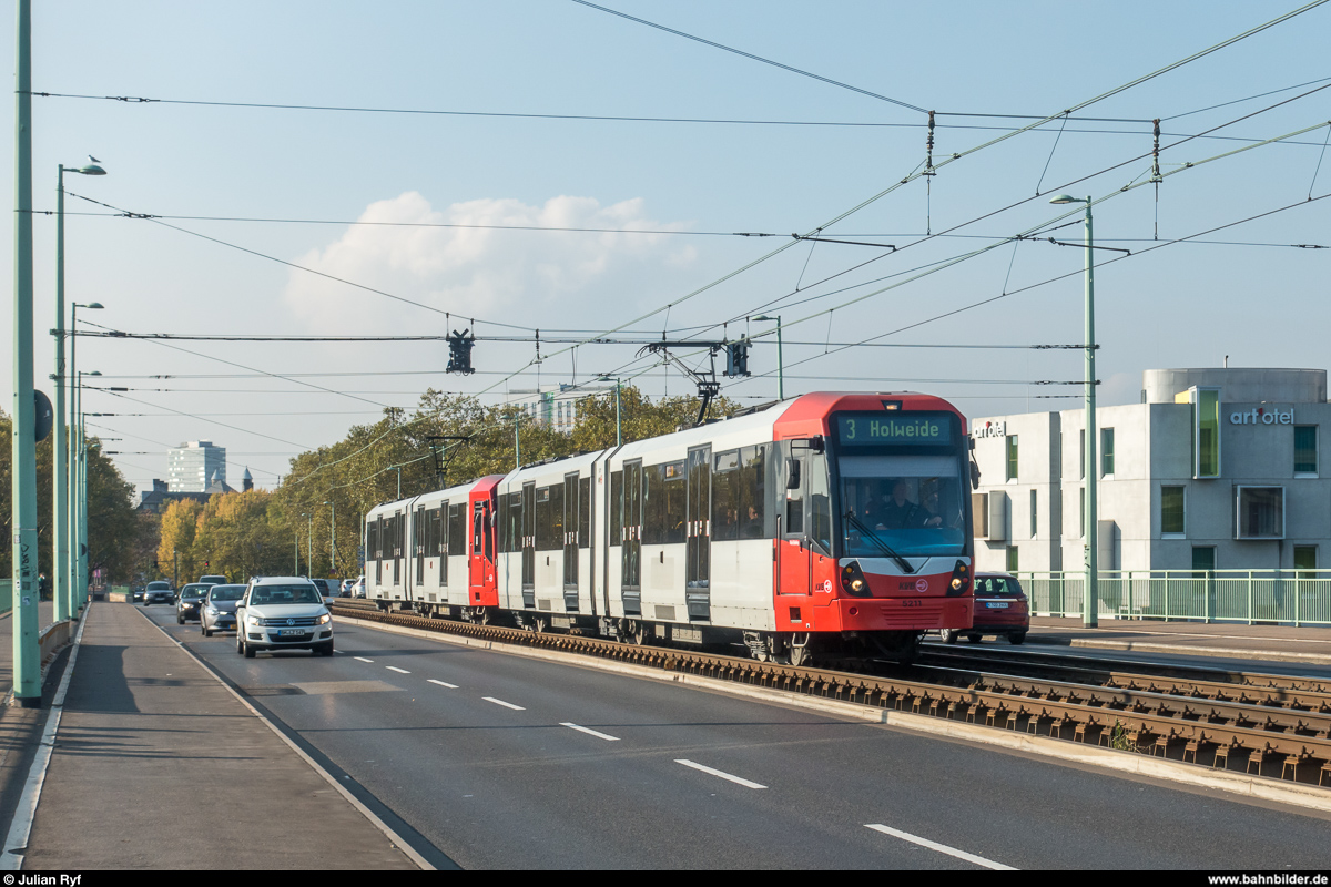 Stadtbahn Köln: Wagen 5211 und ein weiterer K5000 am 3. November 2017 auf der Severinsbrücke.