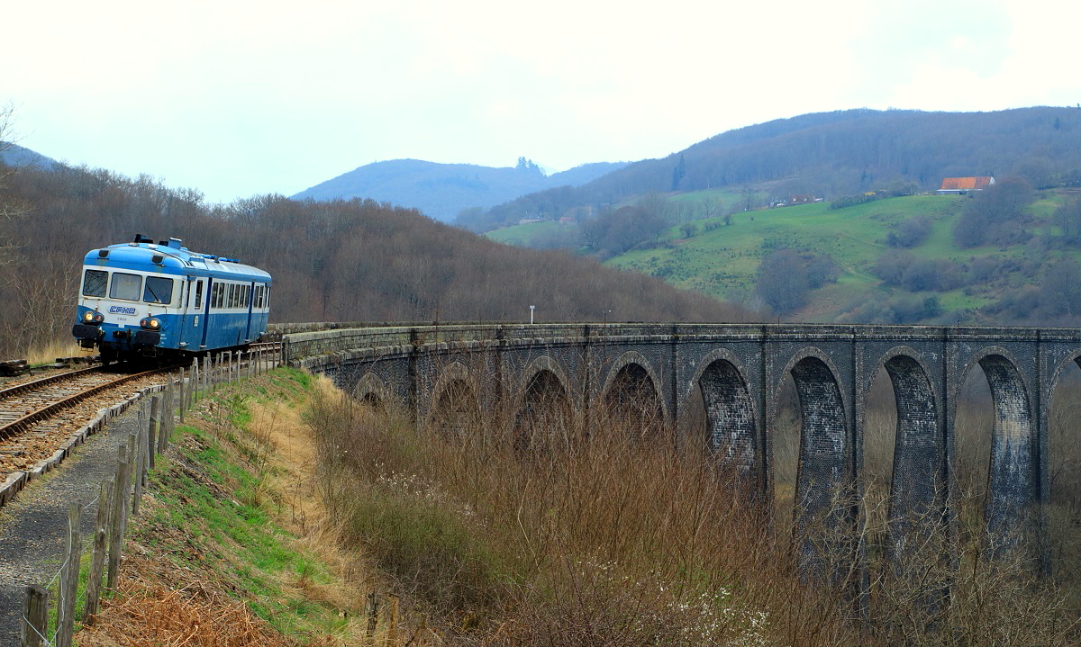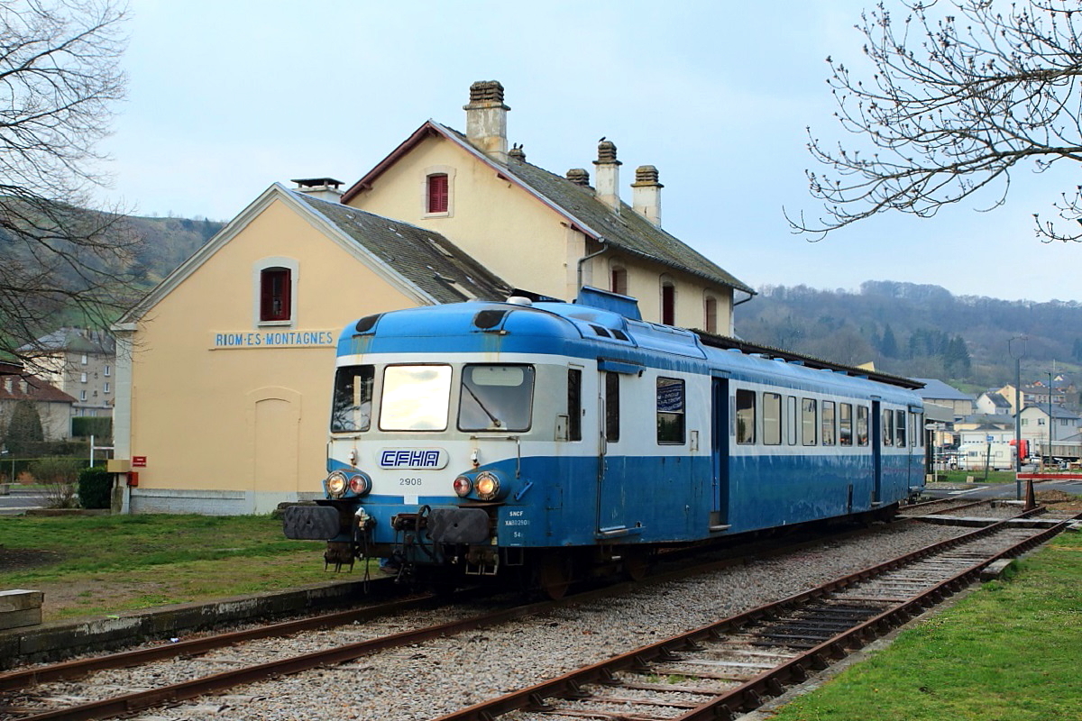 Museums- und Touristikbahnen im französischen Zentralmassiv: Der Gentiane-Express ist Teilstück einer 1950 durch einen Talsperrenbau unterbrochenen Strecke von Paris nach Neussargues, über die früher auch Schnellzüge verkehrten. Heute wird noch ein 16 km langes Reststück zwischen Riom-les-Montagnes und Lugarde betrieben. Am 05.04.2017 überquert der 1961 gebaute X 2908 den Viadukt bei Riom-les-Montagnes. Horst Lüdicke