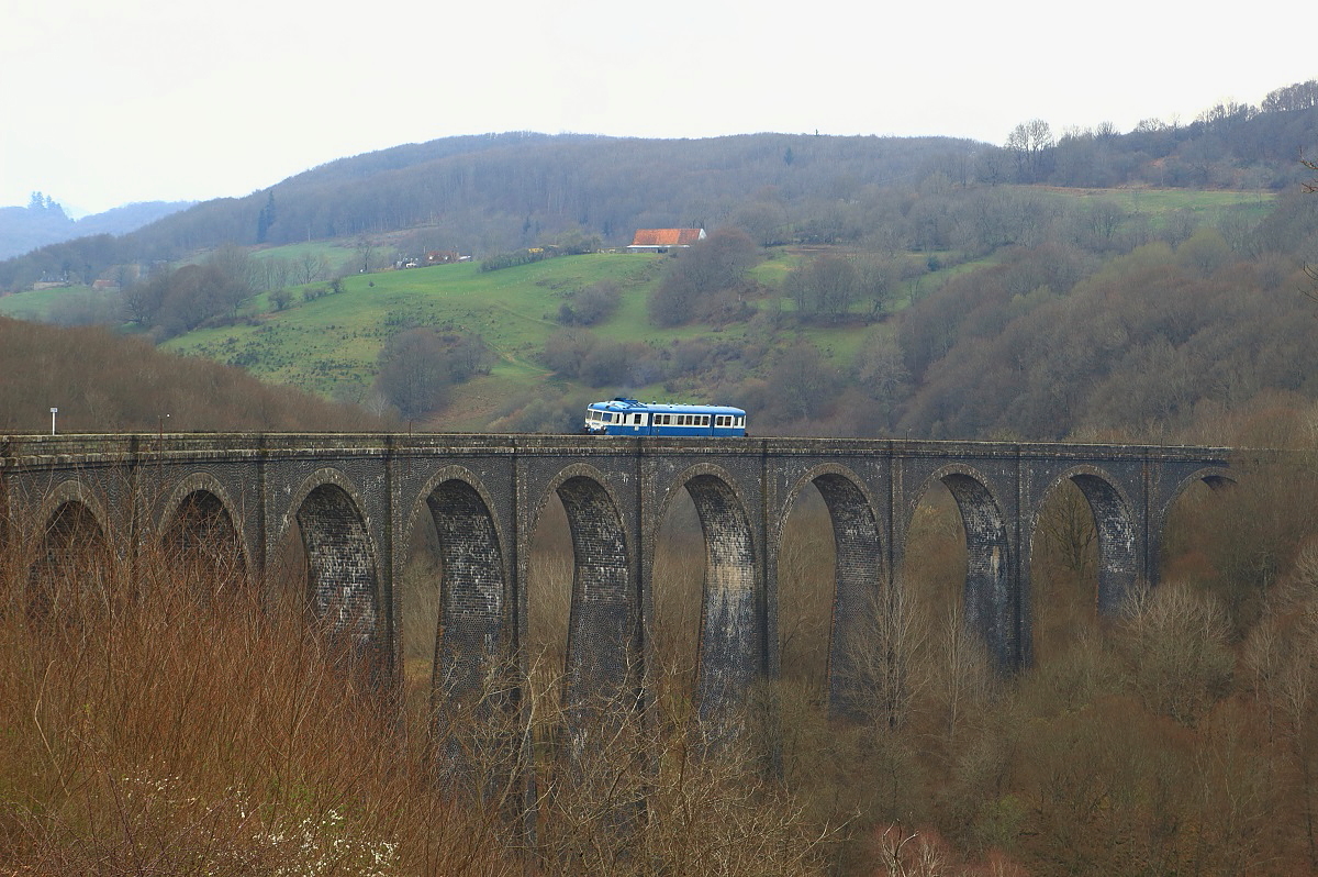 Einige Kilometer hinter Riom-es-Montagnes überquert X 2908 des Train touristique de la Haute Auvergne am 05.04.2017 den Kurvenviadukt von Barajol, der mit einer Länge von 317 m und einer Höhe von 57 m das Tal der Rhue überquert Horst Lüdicke