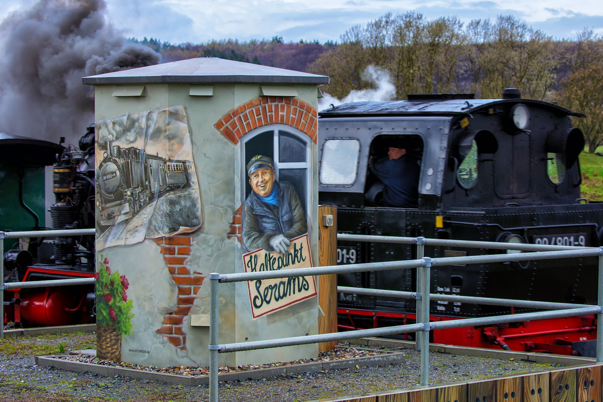 Relaishäuschen am Haltepunkt Karlsburg zeigt einen UBB Fahrgast, Der oder Die sich eine Übersicht über den Streckenplan der Insel Usedom verschafft. Notfalls kann der Leit- und Sicherungstechniker weiterhelfen. - 25.05.2017