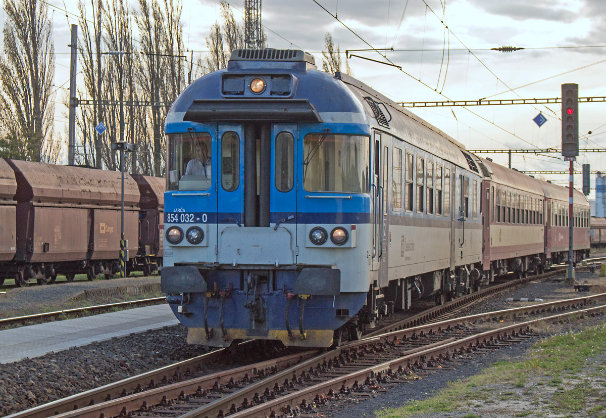 Der 854 032 ist am 12.10.2017 als R 1142 "Svatopluk Čech" von Praha-Vršovice kommend zur Weiterfahrt nach Tanvald gerade bei der Einfahrt in den Bahnhof Všetaty. Die beiden angehängten Schnellzugwagen stellen derzeit die Regelbespannung dar. Thomas Scherf