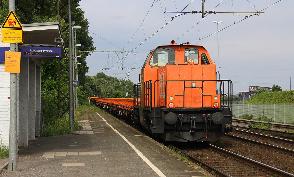 Eine Ranigerlok von BBL kommt mit einem Bauzug aus Oberhausen-West nach Krefeld und kommt aus Richtung Duisburg-Hochfeld-Süd und fährt durch Duisburg-Rheinhausen-Ost in Richtung Duisburg-Rheinhausen,Rheinhausen. Aufgenommen vom Bahnsteig in Duisburg-Rheinhausen-Ost.