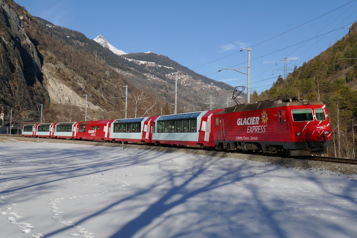 GlacierExpress 902 mit Ge 4/4 II 627 "Reichenau-Tamins" auf der Hinterrheinbrücke bei Reichenau-Tamins. Parallel dazu haben die Vorarbeiten für die zweite Brücke begonnen. (12.05.2017) Herbert Graf