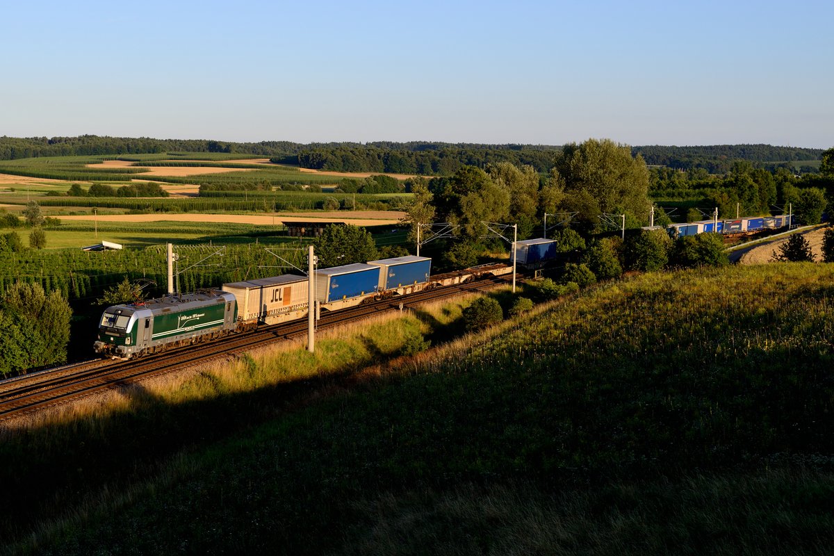 Den DGS 52777 von München Riem nach Lippstadt - besser bekannt als Isar-Ems-Express - zu fotografieren, ist kein leichtes Unterfangen. Zwar verkehrt der Zug recht verläßlich zu den Planzeiten, ist dann aber trotzdem nur im Hochsommer umsetzbar. Weiteres Problem ist die oft mäßige Auslastung des Zuges. Meistens sind die ersten Wagen hinter der Lok unbeladen. Die Bespannung des Zuges ist hingegen attraktiv, hier verkehren der Enercon-Vectron und eine 189 der WLE im Wechsel. Auch die 187 der WLE war schon zu beobachten. Am 13. Juli 2017 konnte ich endlich einmal die 193 803 mit einem halbwegs ausgelasteten Zug bei Fahlenbach in der Hallertau dokumentieren - wenige Augenblicke bevor die Sonne verschwand. Christoph Schneider