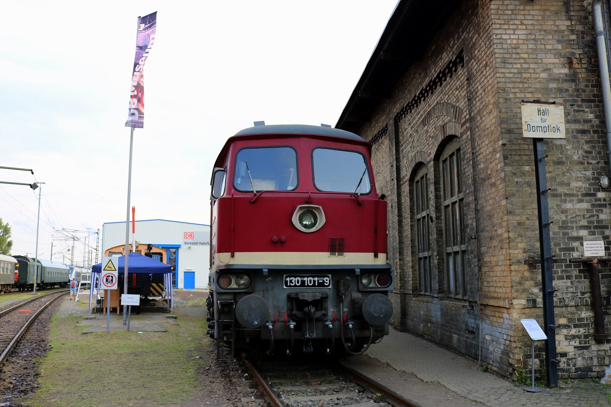 130 101-9 (BR 230) wird auf der Drehscheibe des DB Museums Halle (Saale) anlässlich des jährlichen Sommerfests präsentiert. Zu sehen ist die Lokfront. [26.8.2017 - 16:33 Uhr] Clemens Kral