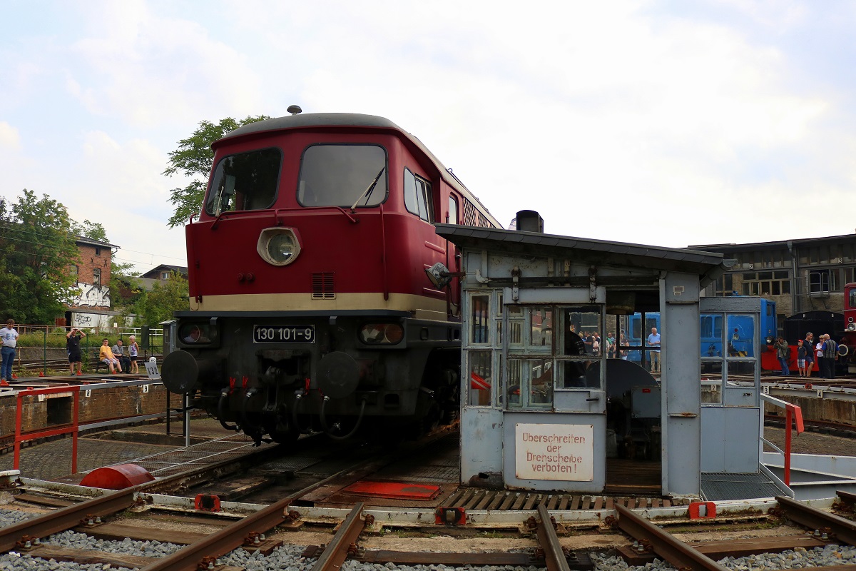 130 101-9 (BR 230) wird auf der Drehscheibe des DB Museums Halle (Saale) anlässlich des jährlichen Sommerfests präsentiert. [26.8.2017 - 16:32 Uhr] Clemens Kral
