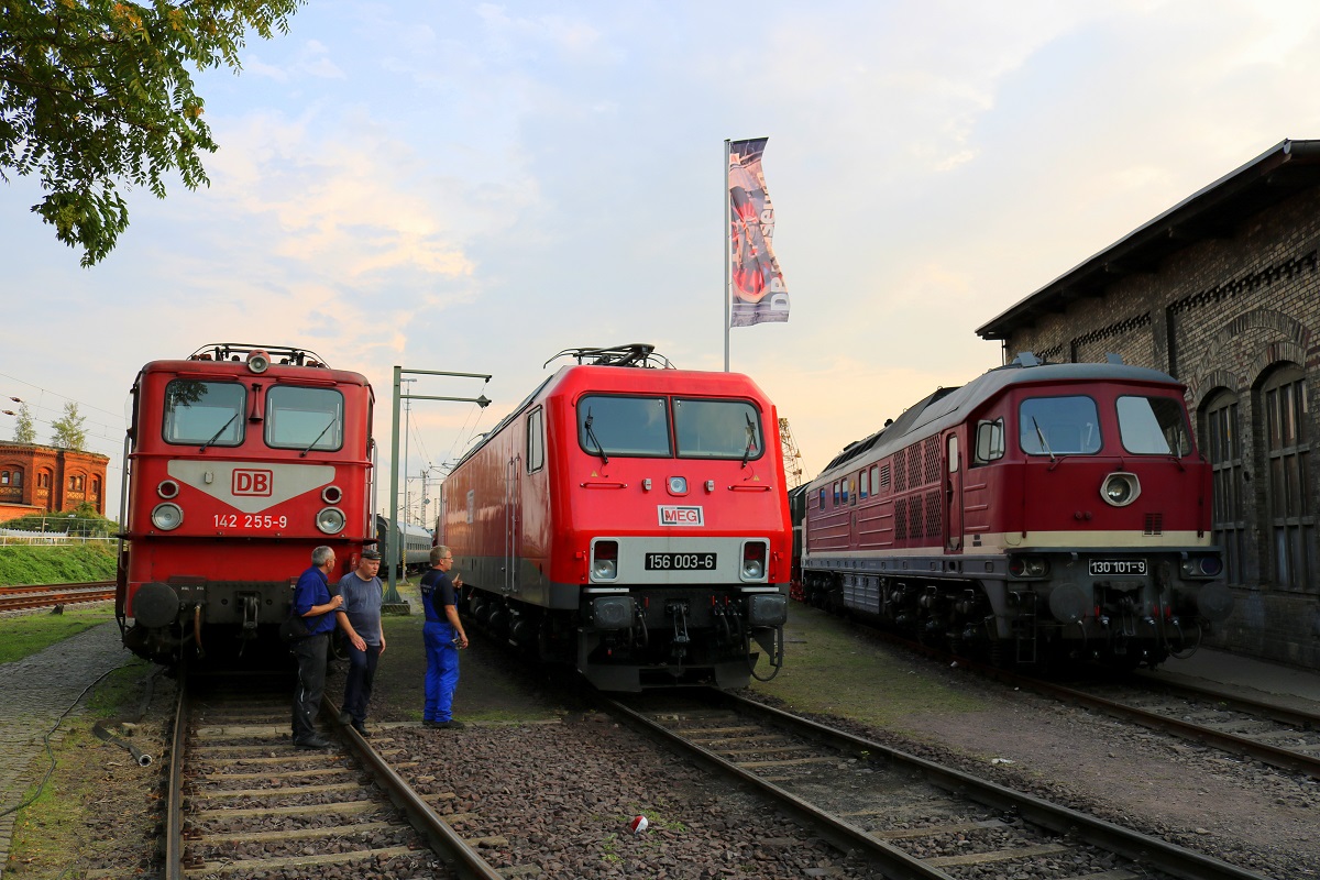 142 255-9, 156 003-6 und 130 101-9 stehen auf dem Gelände des DB Museums Halle (Saale) zur Nachtfotoveranstaltung am Wochenende des jährlichen Sommerfests. [26.8.2017 - 19:18 Uhr] Clemens Kral