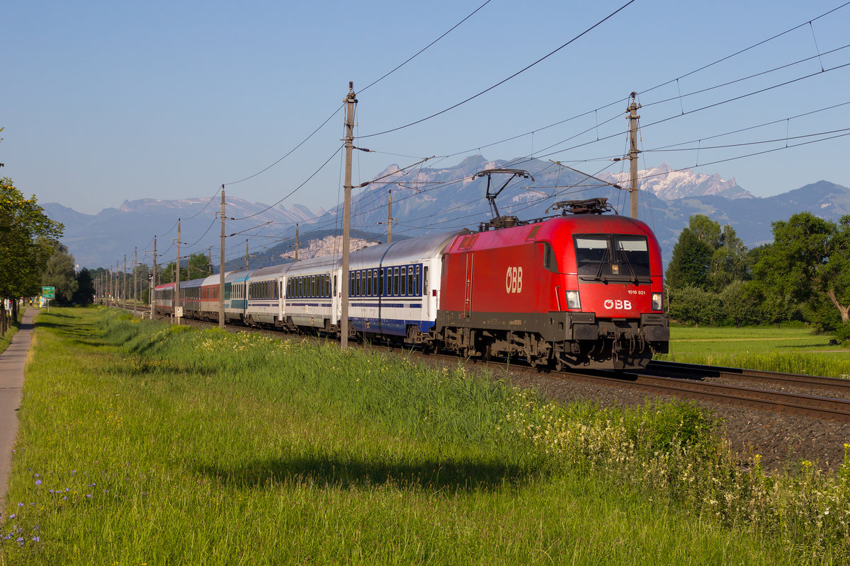 1016 021-8 zieht ihren EuroNight durch Vorarlberg auf der Umleiterstrecke nach Zürich . Zwischen Hohenems und Dornbirn. Fahrtrichtung Dornbirn. 26.6.2017 Marvin Schenk
