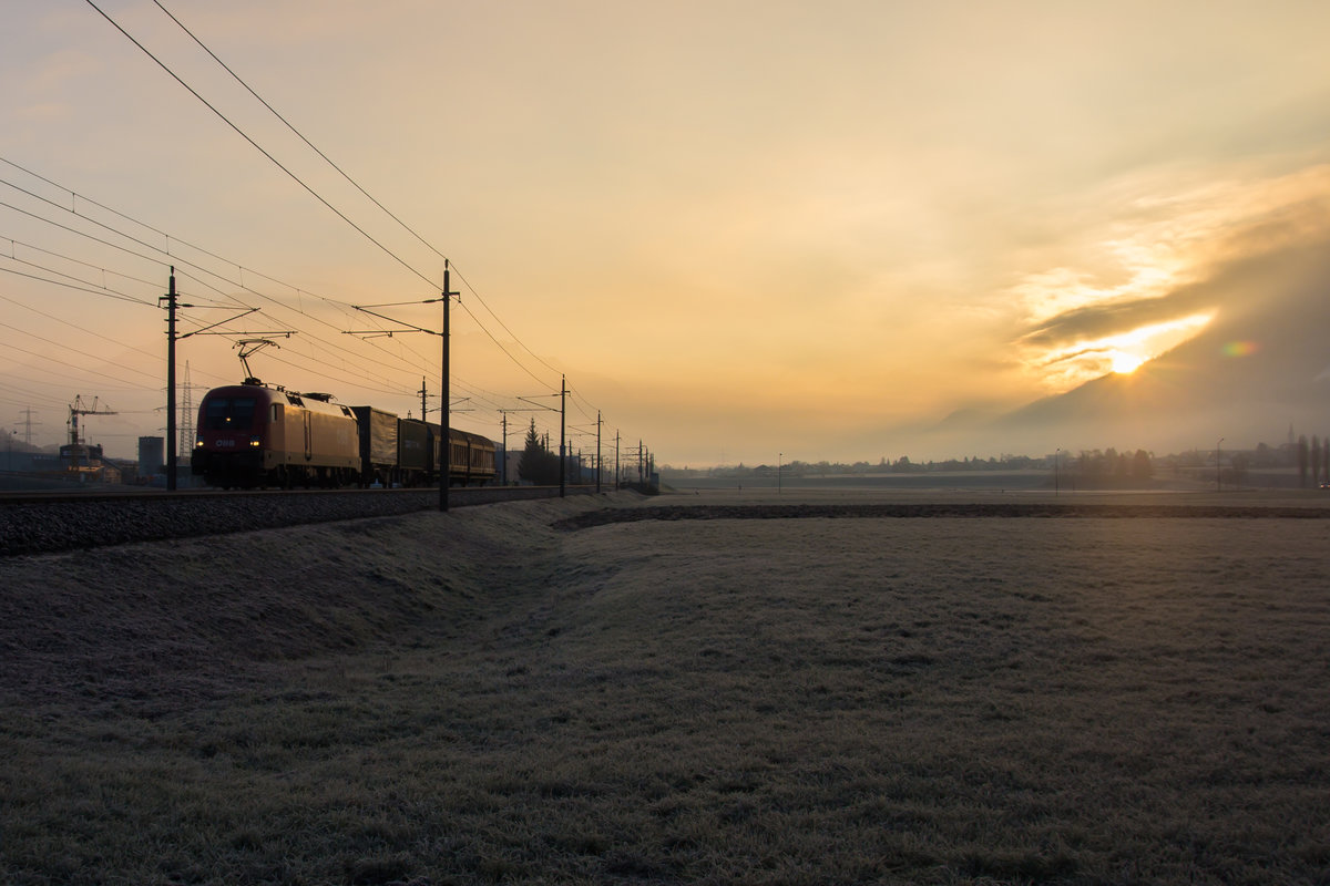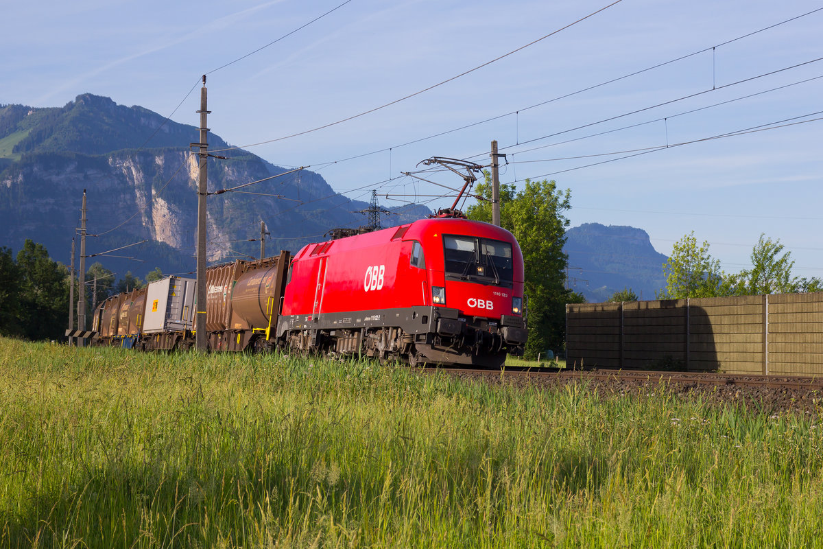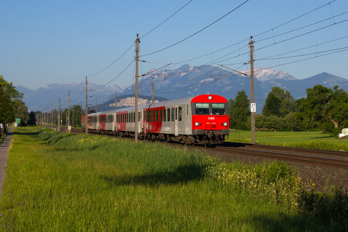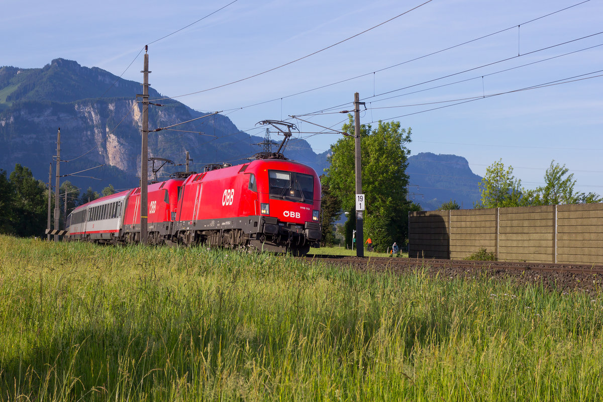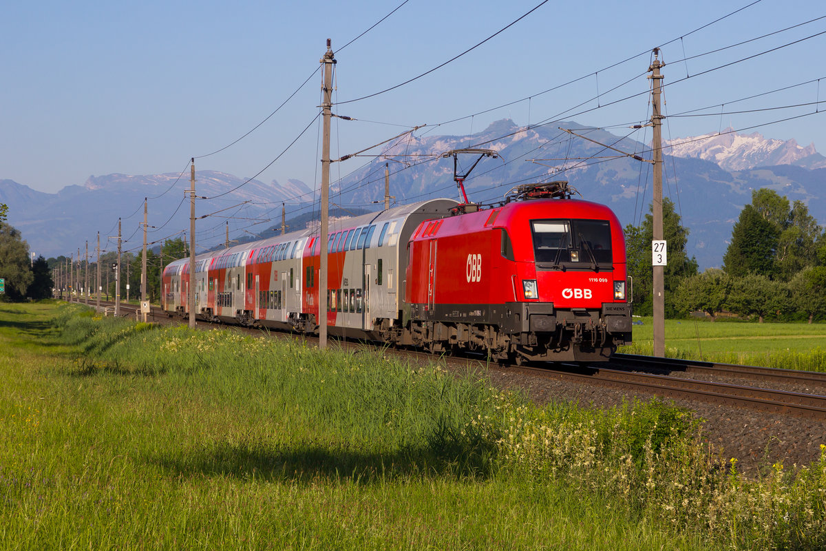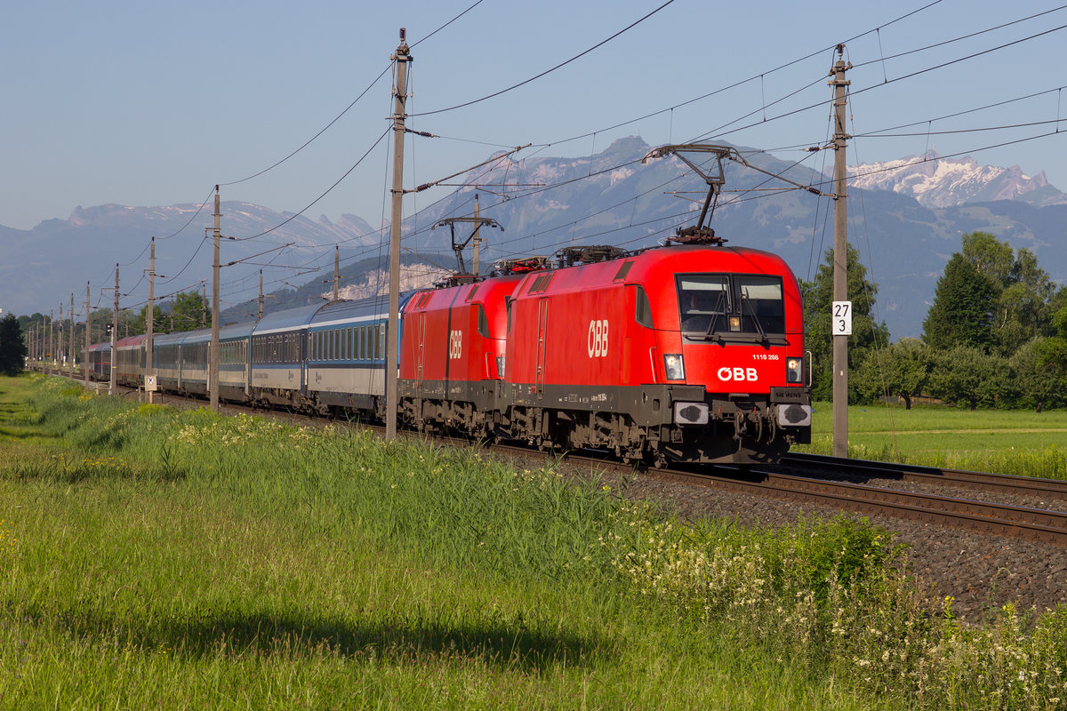 1116 113-2 mit ihrer Schwester zieht sie den EuroNight über die Umleiterstrecke in Vorarlberg nach Zürich. Fahrtrichtung Bregenz kurz vor Schwarzach. 8.6.17 Marvin Schenk