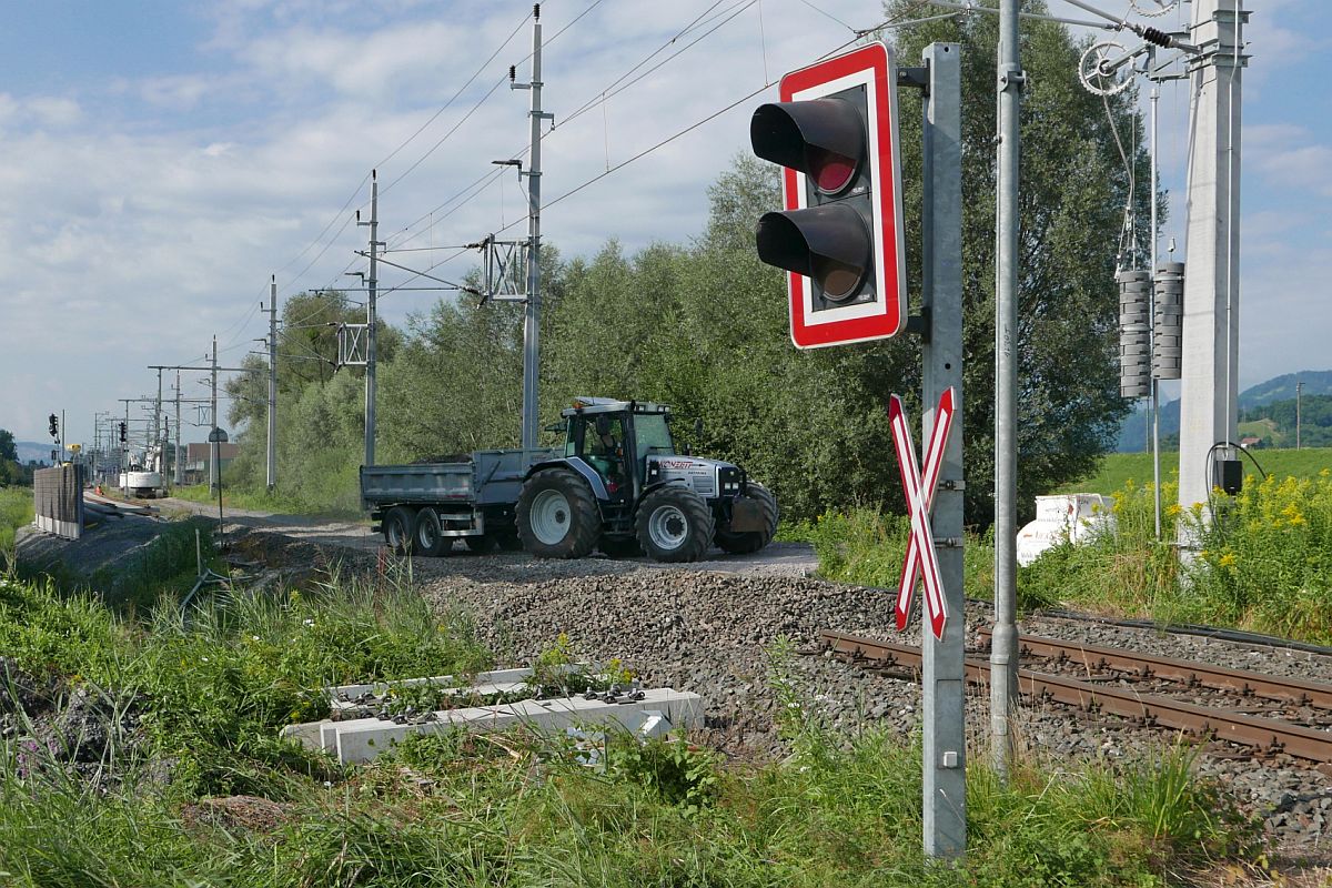 Mal keine Schienen- sondern Radfahrzeuge auf dem Gleisbett. Im Rahmen des Umbaus der Gleisanlagen im Bahnhof von Lustenau wird am 05.08.2017 mit Traktoren und Anhängern Altschotter abtransportiert. Jürgen Vos