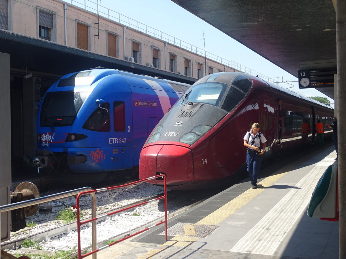 Venedig S. Lucia, 3.August 2017: Llinks "Flirt ETR 343 von FS/ Regione del Veneto und AGV "Italo" No.14 des privaten Fernverkehrbetreibers NTV Andreas Bogott