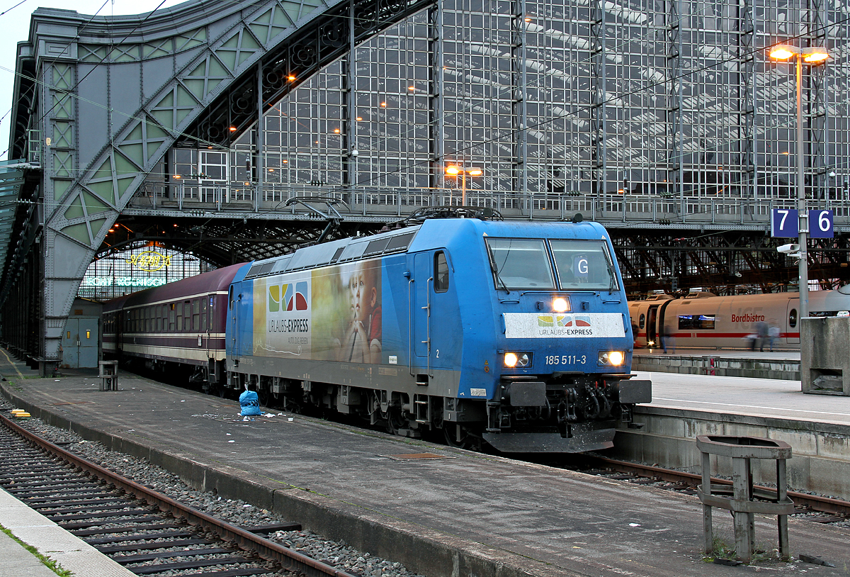 185 511-3 "Urlaubs-Express" unterwegs mit Wagen der Müller Touristik, kommend aus Richtung Hagenower Land. Eventuell eingesetzt für Kreuzfahrttouristen aus Rostock oder Hamburg, schön sieht das Gespann auf jeden Fall aus. 3km östlich von Büchen 29.09.2017 Stefan Bree