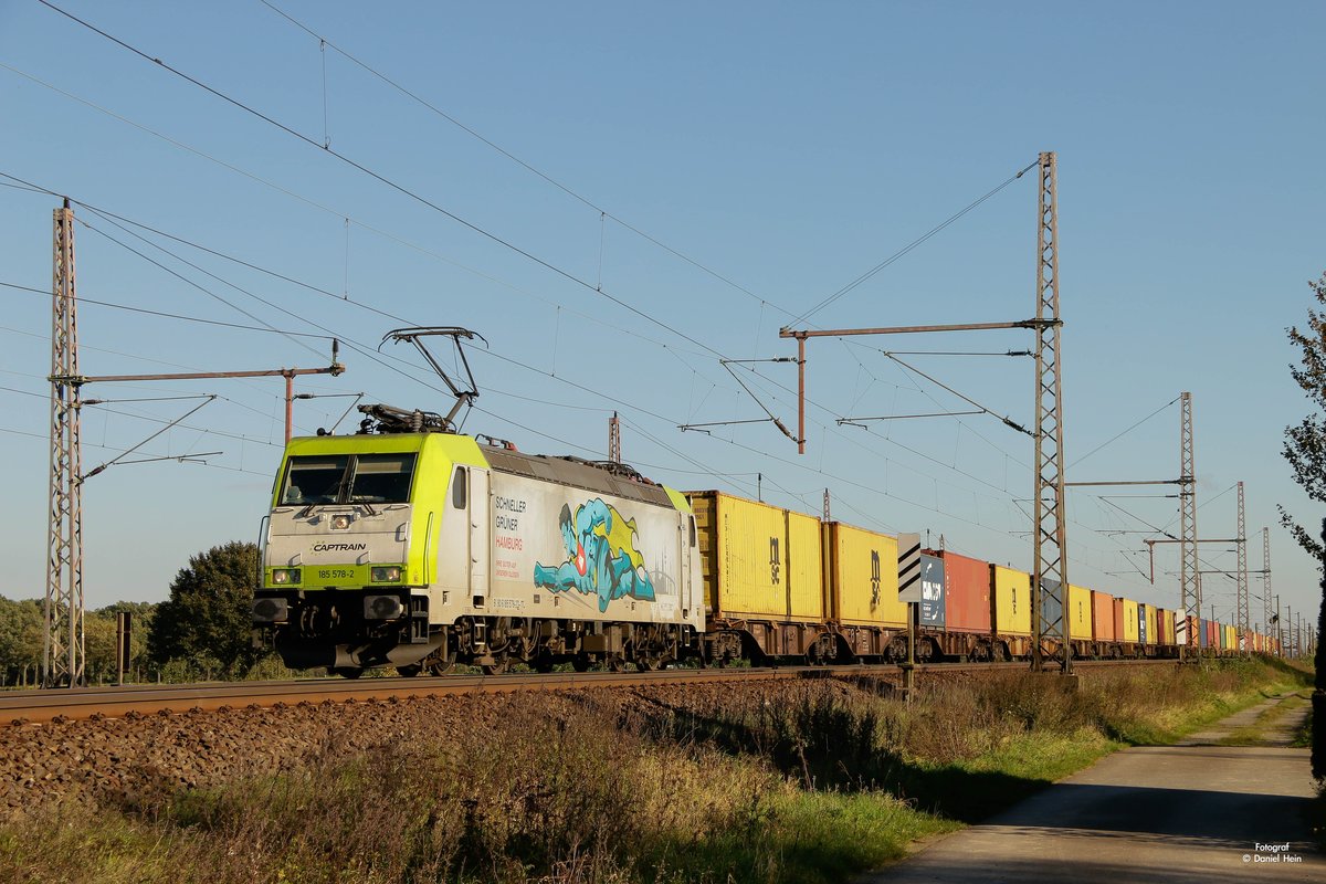 Mit einem KLV nach Italien war am Nachmittag des 31.10.2017 die 185 399-3 "399" nördlich von Müllheim (Baden) durchs Rheintal in Richtung Schweiz unterwegs. Tobias Schmidt