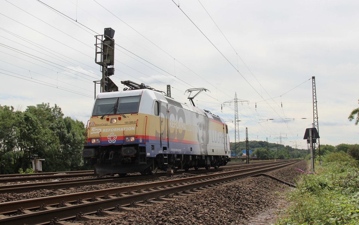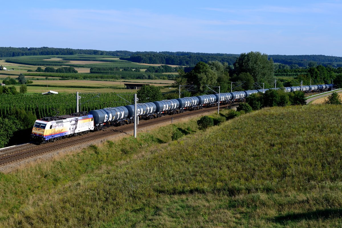 Und weil sie so gelungen ist, gleich noch ein Bild der Luther-Lok an der kürzlich bereits umgesetzten Stelle: Am 07. August 2017 überraschte mich die 185 589 von RheinCargo erneut, als sie mit einem leeren Kesselwagenzug die Fotostelle bei Fahlenbach passierte. Allerdings musste ich diesmal etwas früher auslösen, da es sonst zu einem "Gegenzug-Schaden" gekommen wäre. Diese Lok ist in meinen Augen einer der am besten gelungensten Werbeloks, die aktuell auf deutschen Schienen verkehrt. Sie erinnert an 500 Jahre Reformation. Selbige wird auf 1517 datiert, als Martin Luther seine 95 Thesen an die Tür der Schlosskirche zu Wittenberg geschlagen haben soll. Auch im katholischen Oberbayern ist die Lok ein "Hingucker". Christoph Schneider