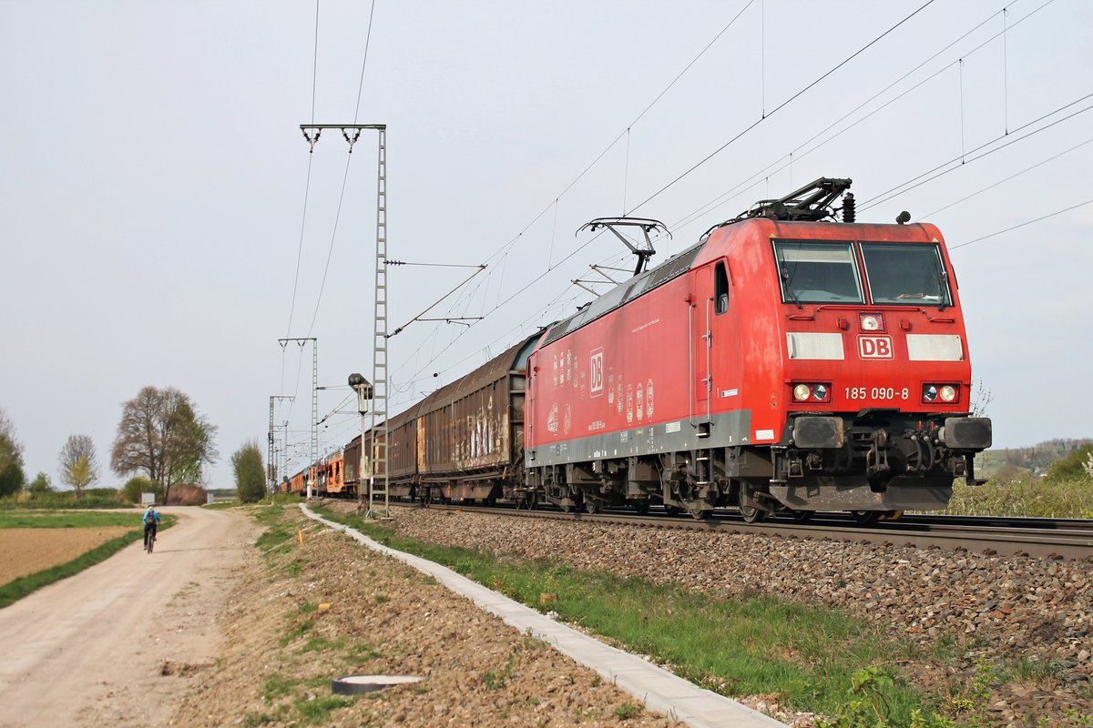 Am Nachmittag des 05.04.2017 bespannte die 185 090-8 "Bombadier Werk Kassel" einen gemischten Güterzug (Mannheim Rbf - Basel Bad Rbf), als sie nördlich von Müllheim (Baden) in Richtung Süden fuhr und nur noch wenige Kilometer bis zum Zielbahnhof vor sich hatte. Tobias Schmidt
