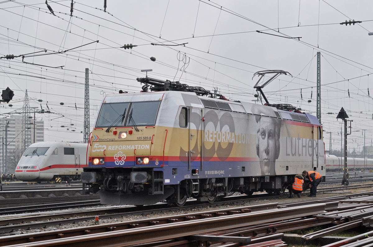 Lok 185 589-9, mit der 500 Jahr Reformation durch Luther Dekoration, ist beim Badischen Bahnhof abgestellt. Die Aufnahme stammt vom 20.12.2017. Markus Wagner