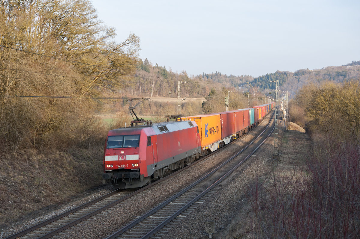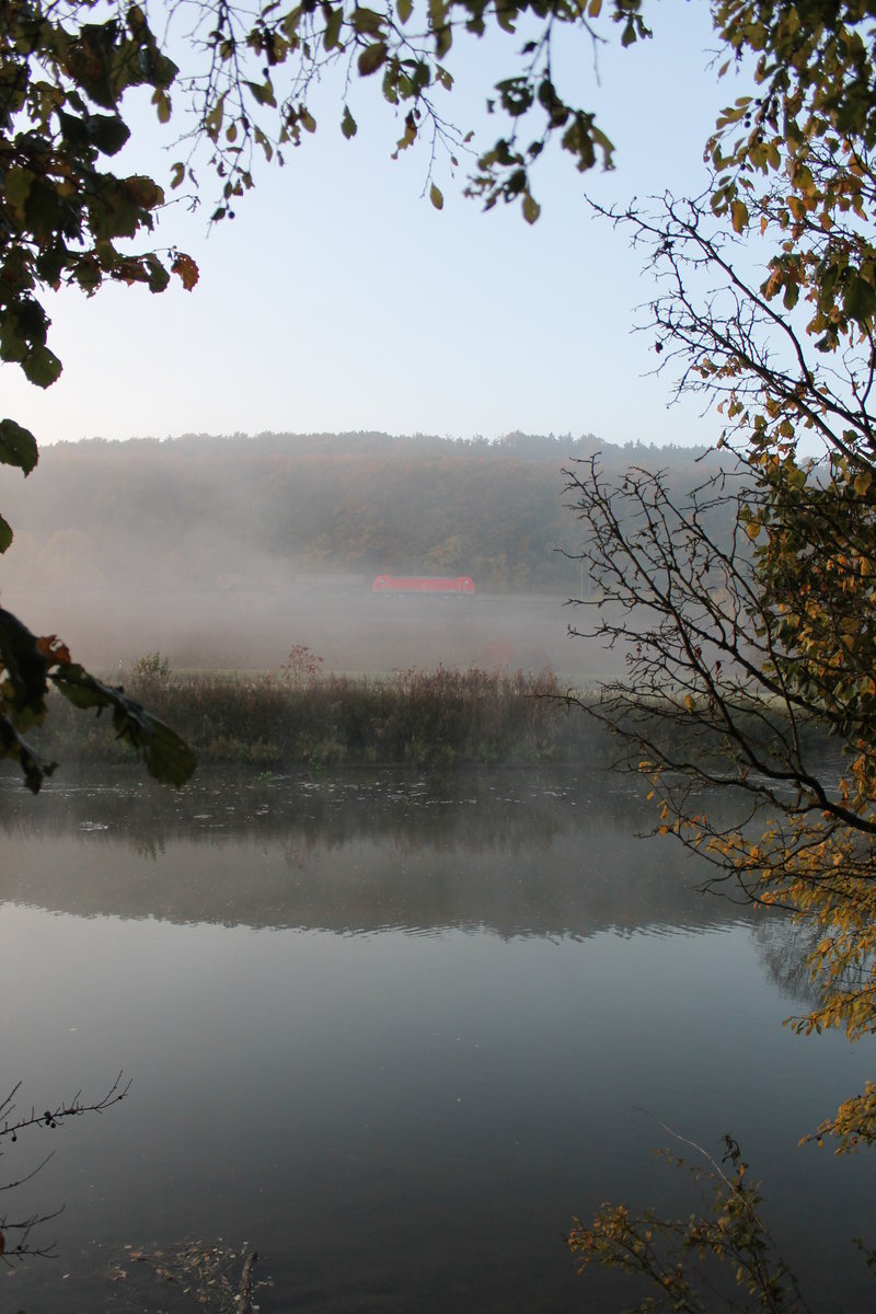 Der Nebel wabert am 17.10.2018 noch über die Altmühl, als eine unbekannte 152 oder 185 mit ihrem Kesselwagenzug Richtung Treuchtlingen vorbeidonnert. Daniel Bauch